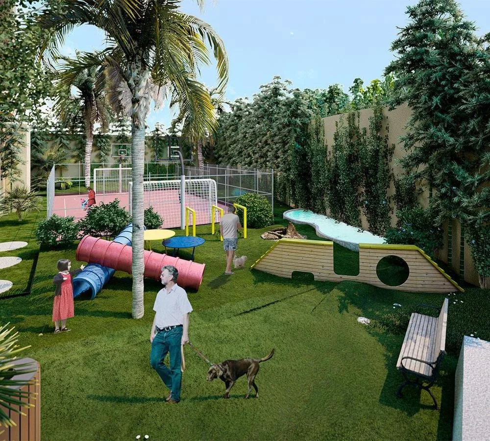 The residential complex offers a wide array of amenities for residents. These include a swimming pool, a bowling alley, a cinema, a gym, and a yoga area. Recreational facilities consist of a paddle tennis court and a dedicated cycling path. The property provides secure, gated access with a security booth and includes parking.