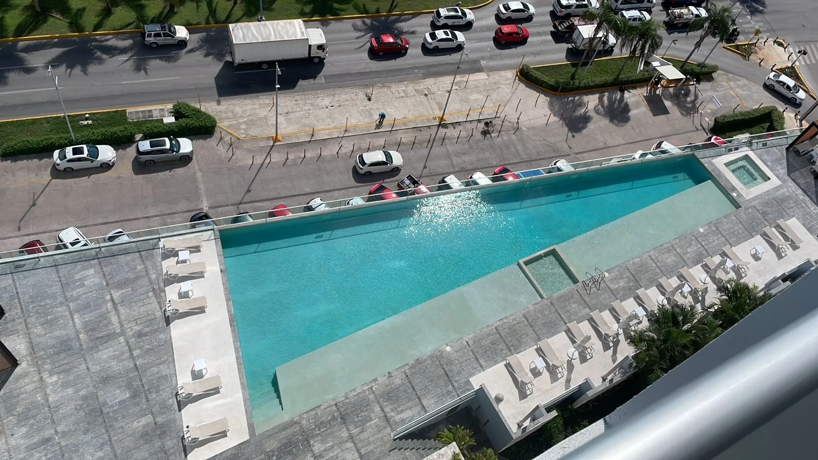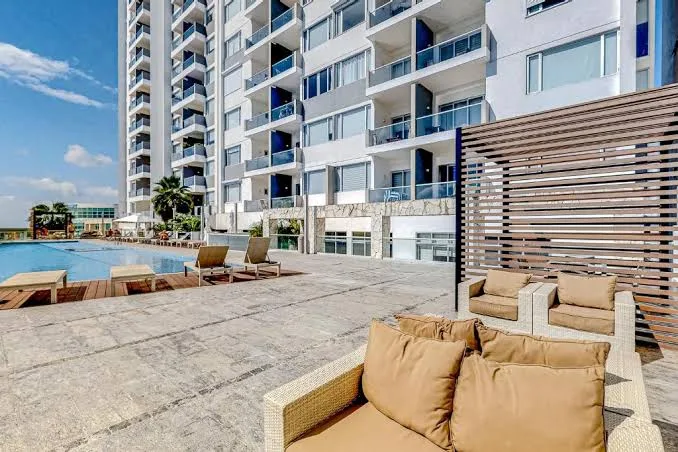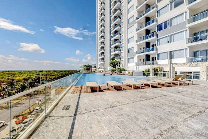 The residential complex offers 24-hour security, a swimming pool, a jacuzzi, a gym, and an event room. Its location within Malecón Américas places it near Cancun's main commercial center, Plaza Las Américas. This provides access to services including banks, supermarkets, pharmacies, cinemas, restaurants, and boutiques.
