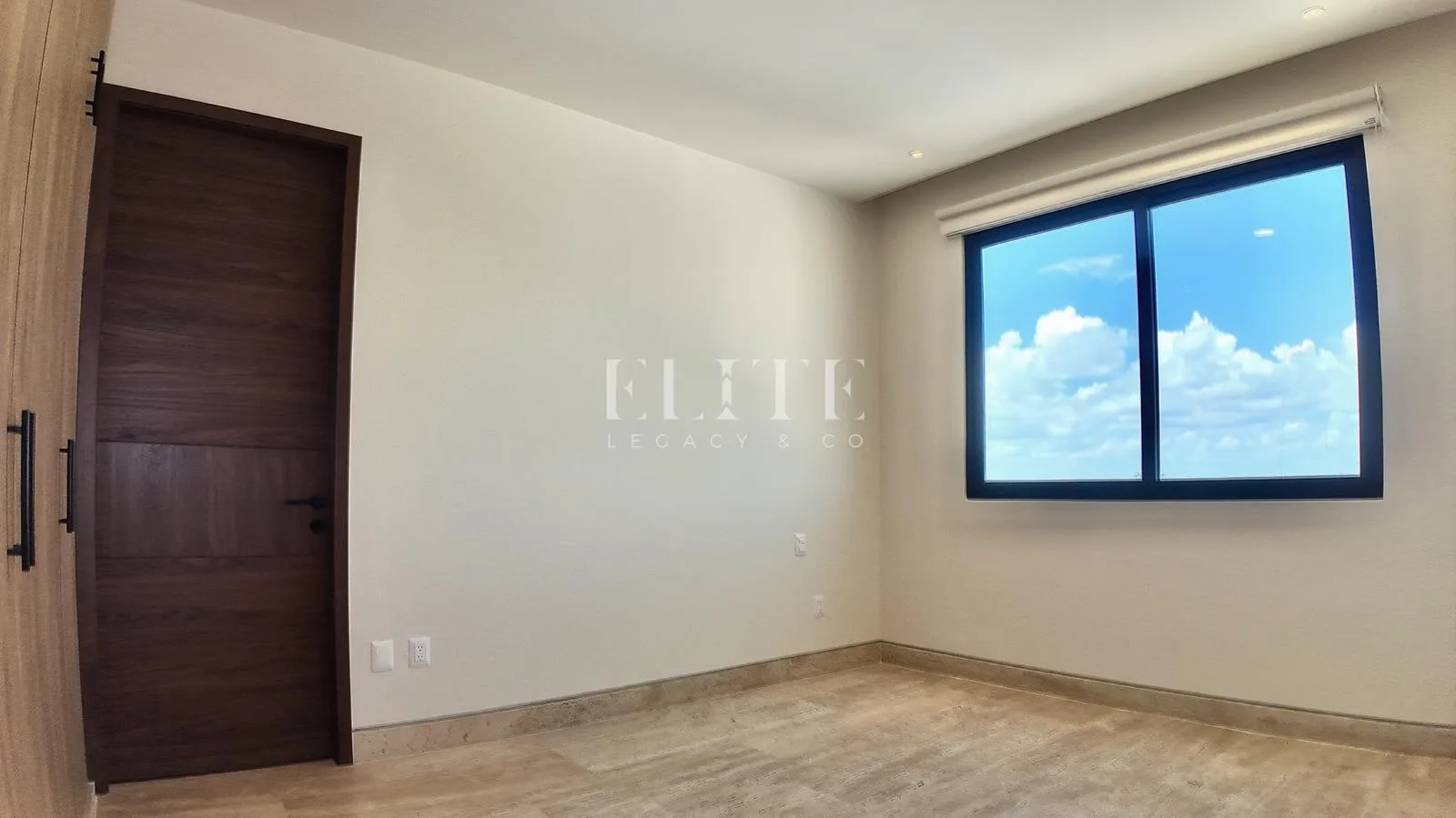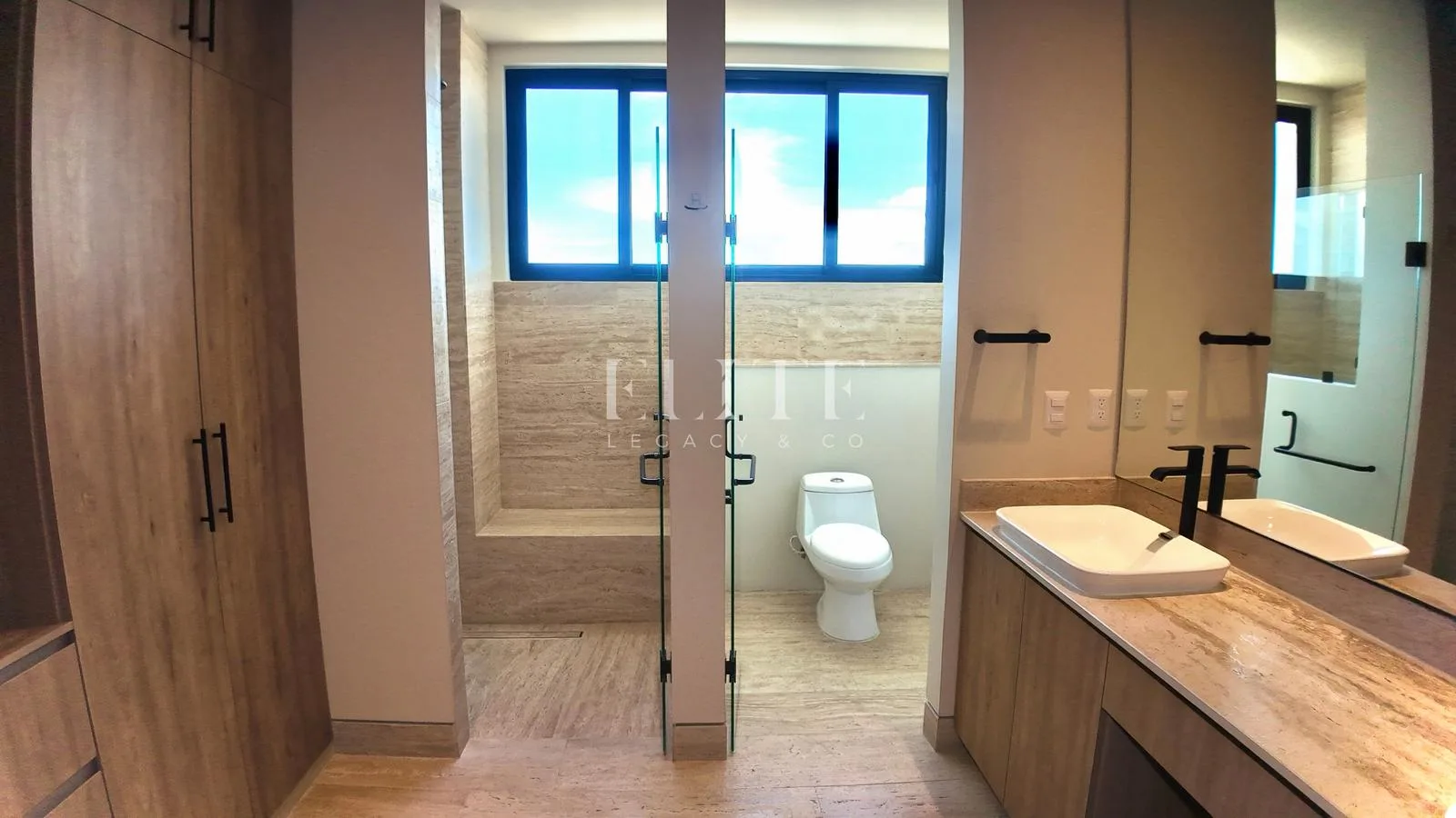 The first level of the unit comprises a living and dining room, an equipped integral kitchen, a pantry, and a complete bathroom for guests and secondary bedroom use. A large terrace provides views of the Nichupté lagoon. There are three bedrooms, each with a closet and en-suite bathroom. Additionally, there is a laundry room, a service room, a service entrance, and covered parking for two cars.