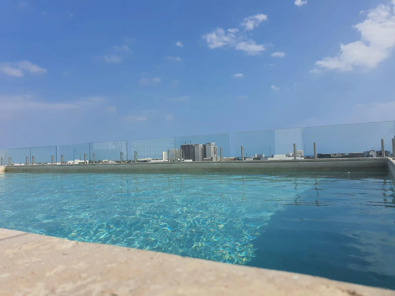 The building features an exclusive rooftop with a spectacular swimming pool and a sundeck terrace, perfect for socializing and enjoying impressive sunsets. A barbecue grill area complements the rooftop experience. From the rooftop, residents can enjoy impressive panoramic views of the lagoon.