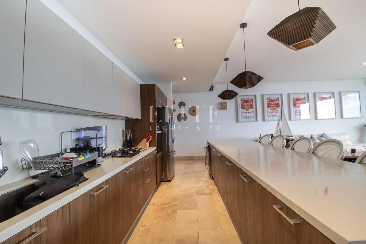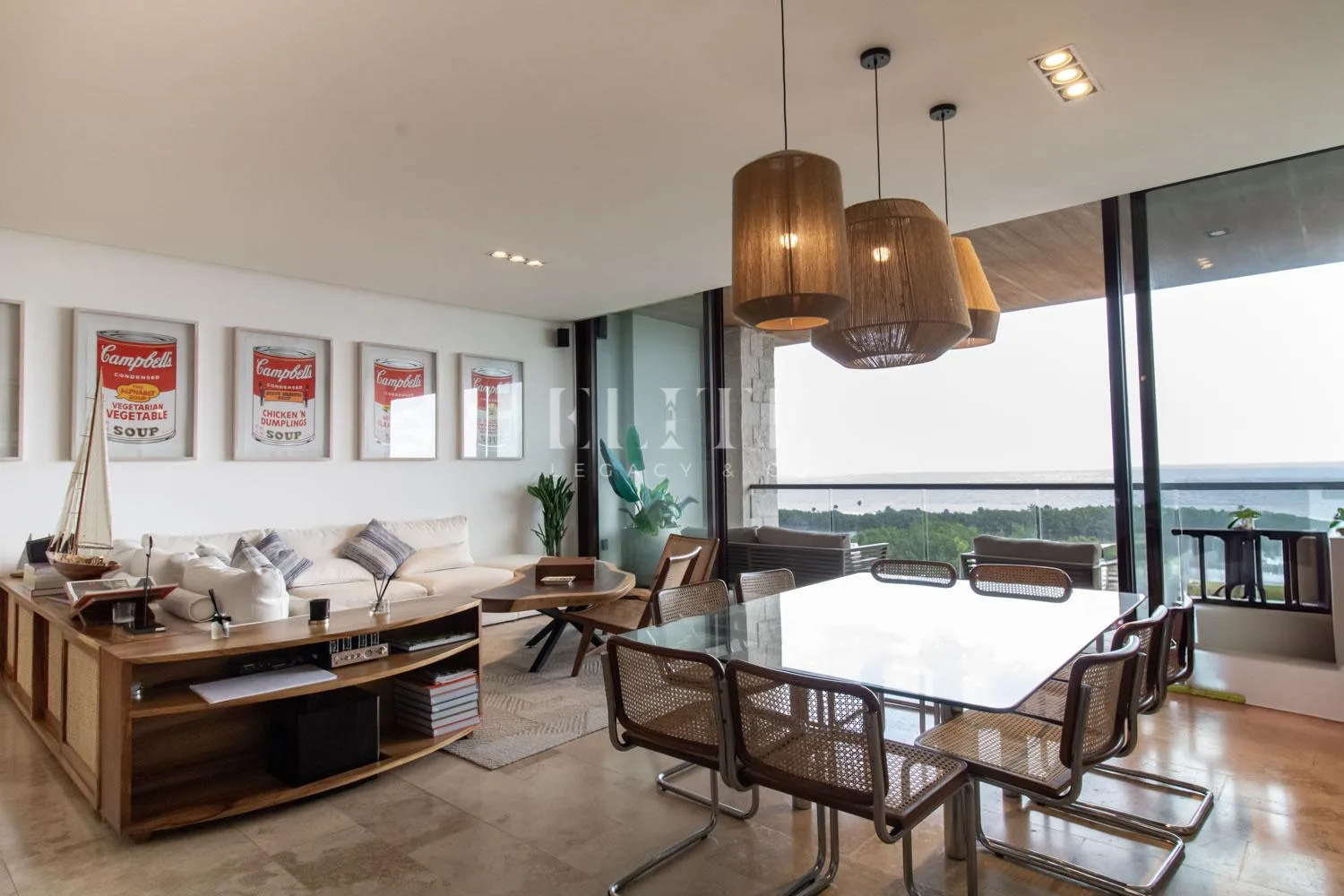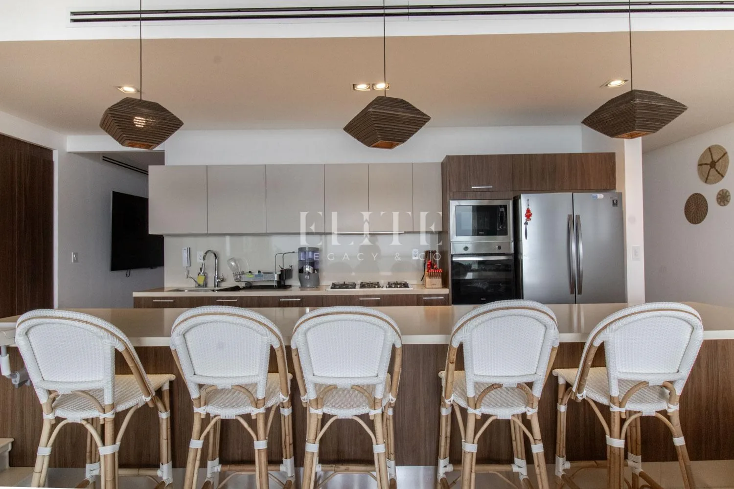 The apartment is a corner unit on the fifth floor, offering a beautiful view of the Caribbean Sea. It is fully furnished and equipped. The layout includes an entry foyer leading to a spacious living and dining area for eight people. The kitchen is fully equipped with an integral design and a generous breakfast bar.