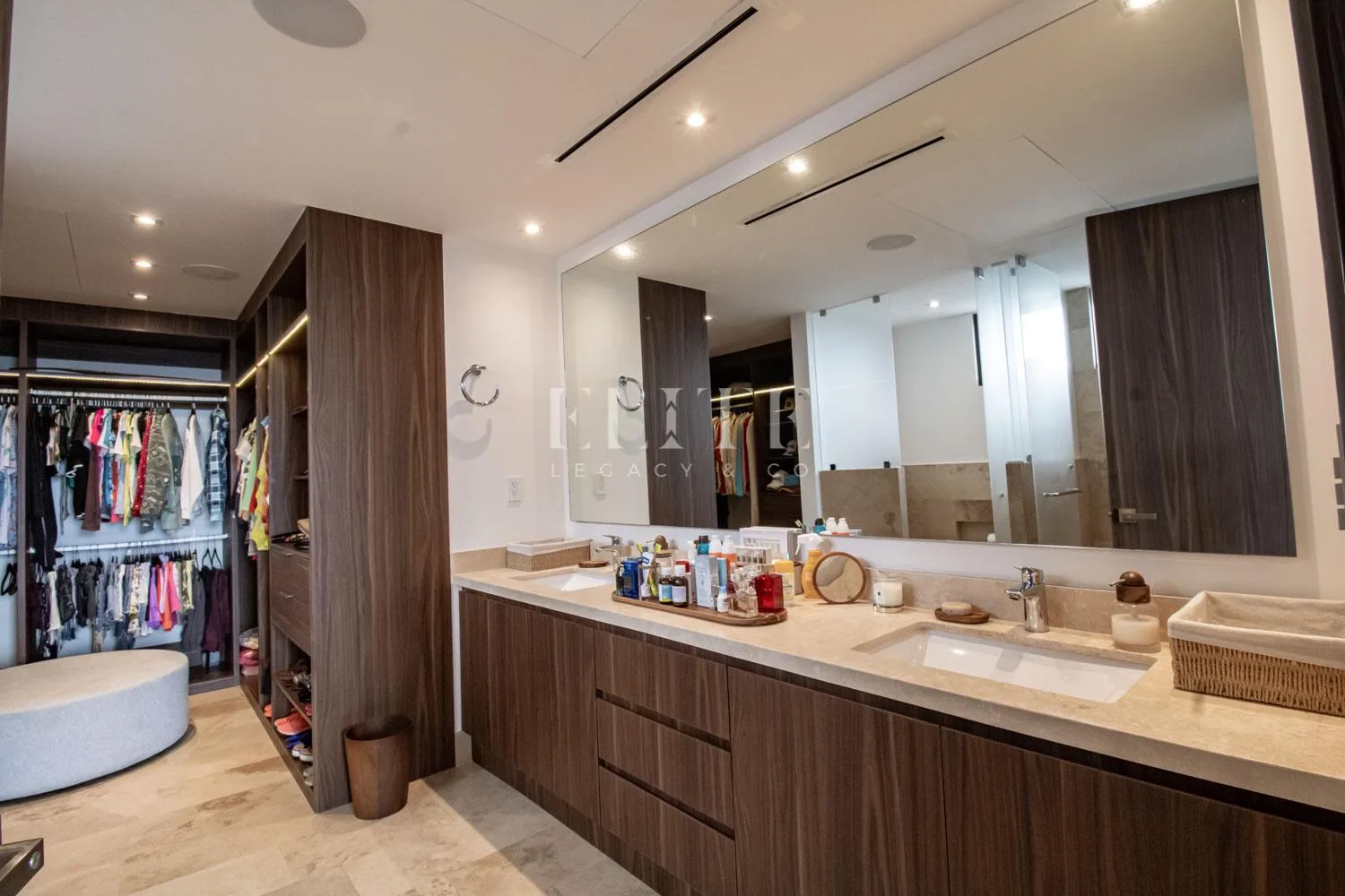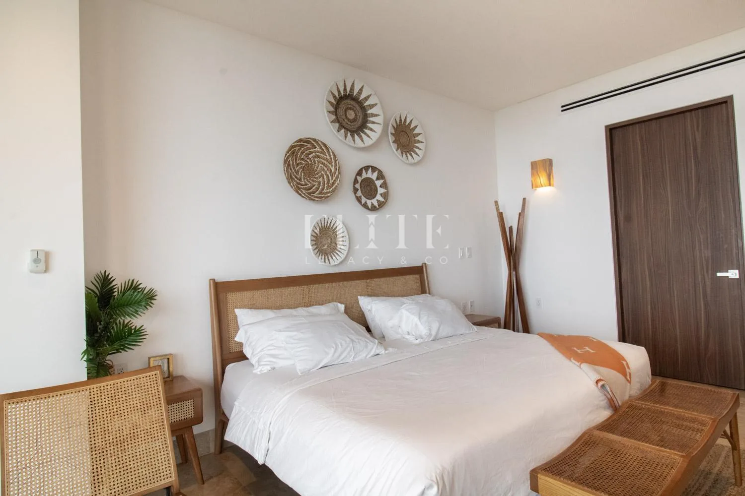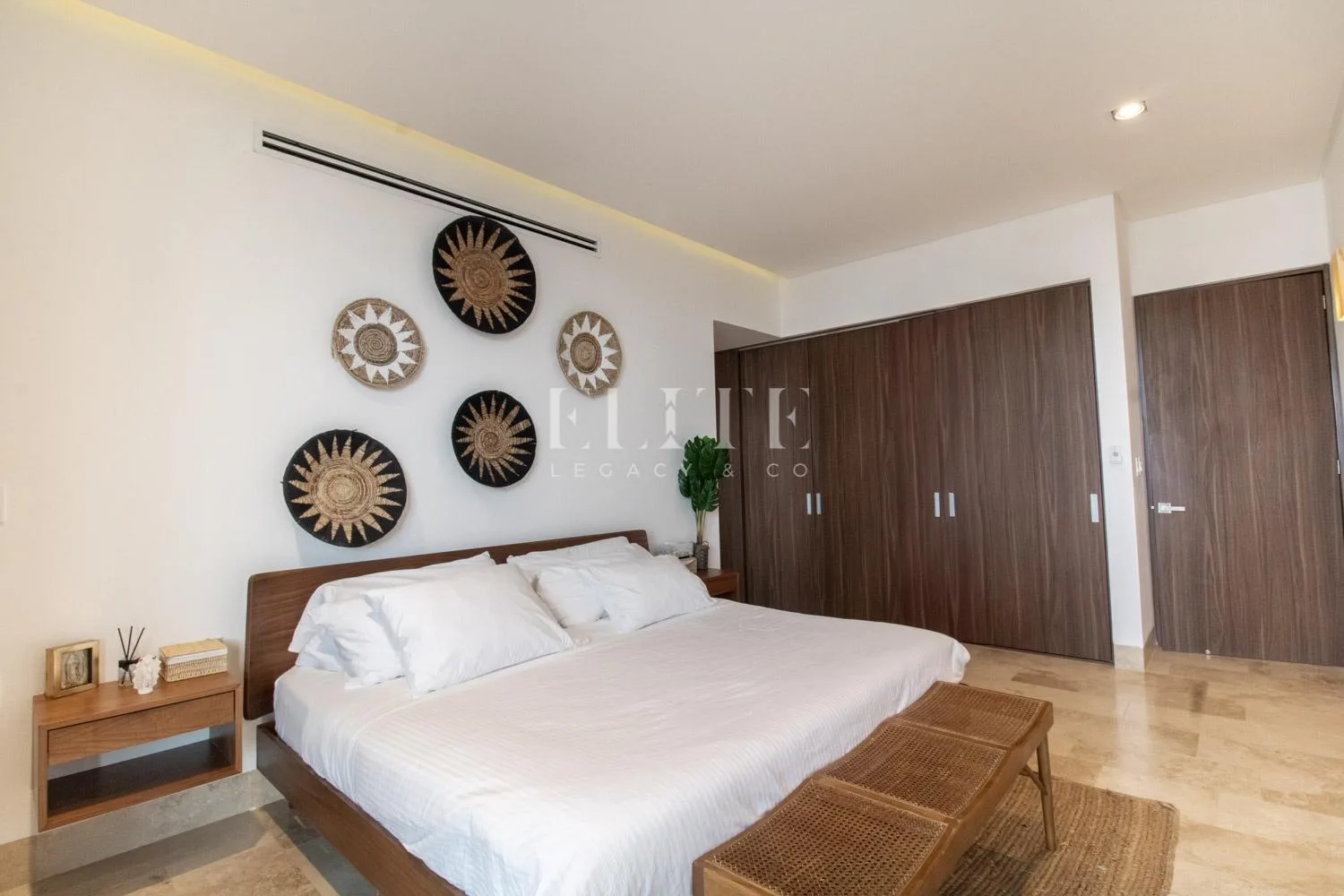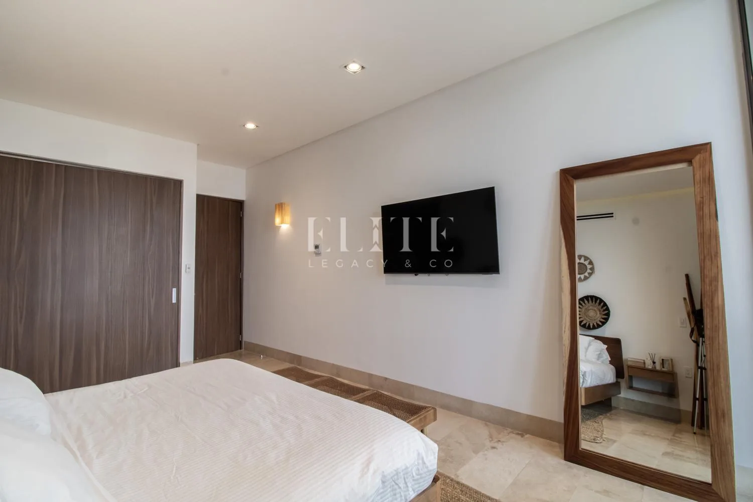 A terrace with outdoor furniture provides a beautiful view. The primary bedroom features a spacious walk-in closet and a private bathroom, with direct access to the terrace. There is a separate, well-equipped television area.