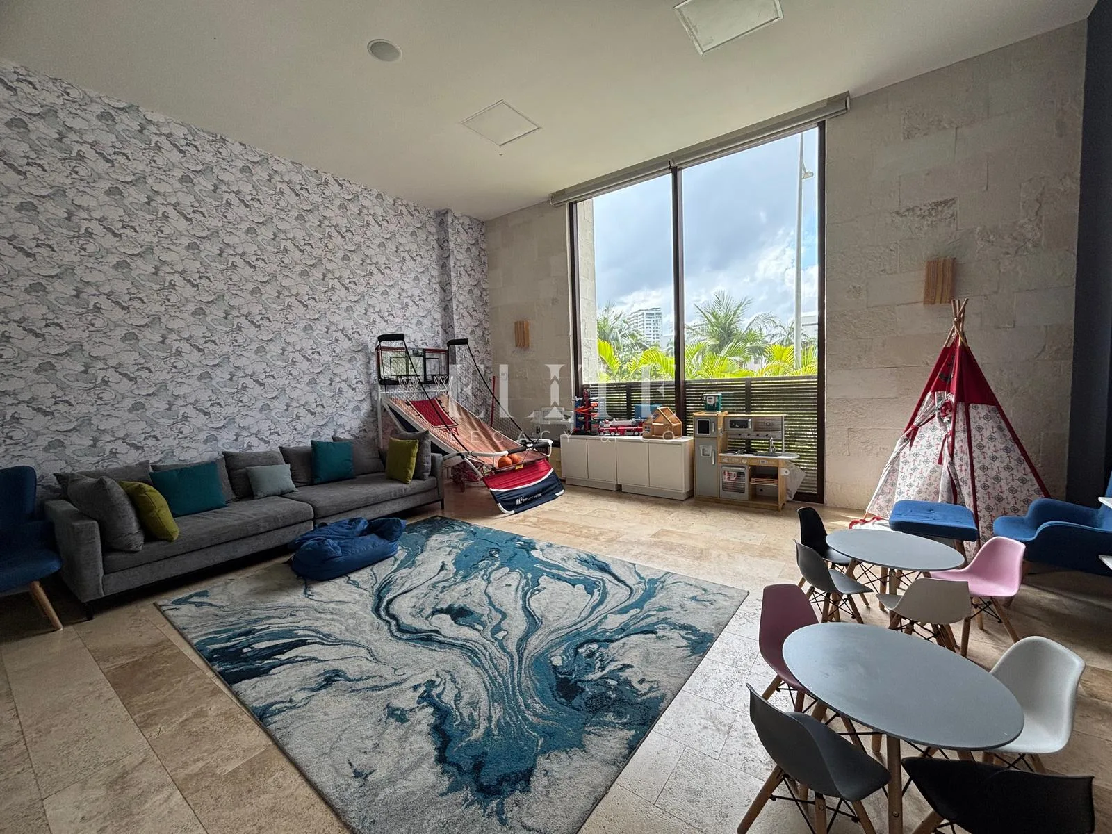 Building amenities consist of a lobby, a playroom, a kids' club, a gym, a swimming pool, a jacuzzi, a covered terrace for events, and a roof garden with a barbecue area.