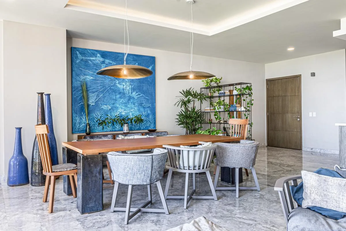 The residence offers a fully integrated living room, dining area, and kitchen, all with views. A terrace connects these spaces to the main bedroom.