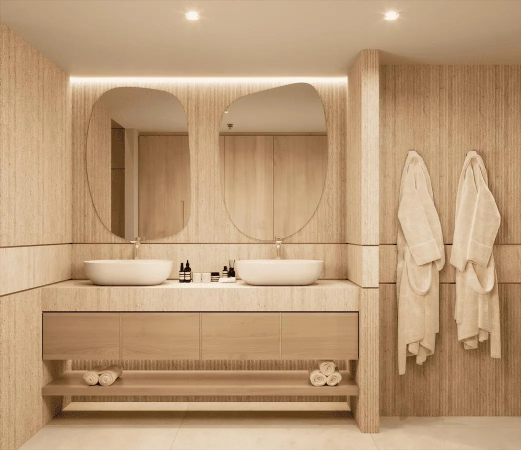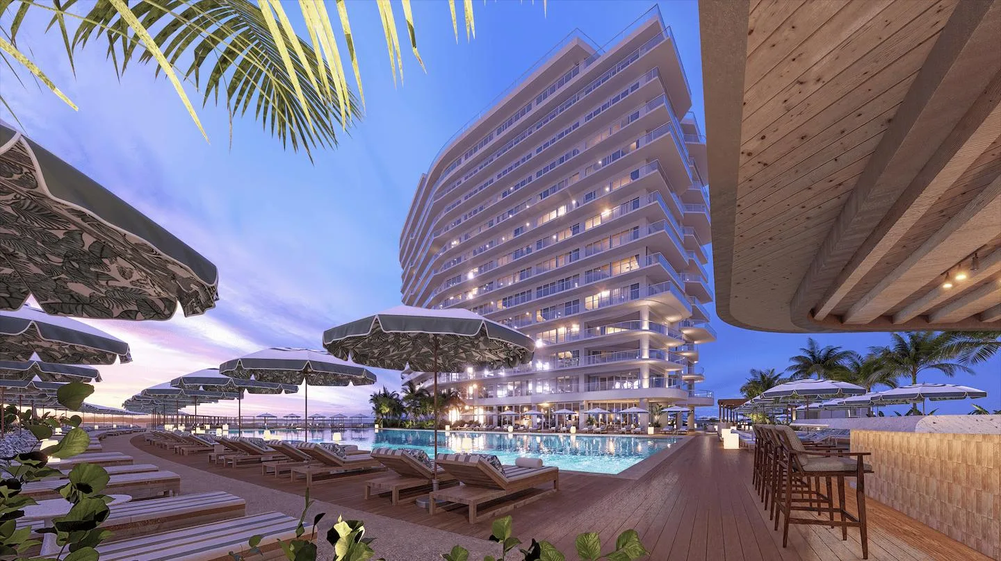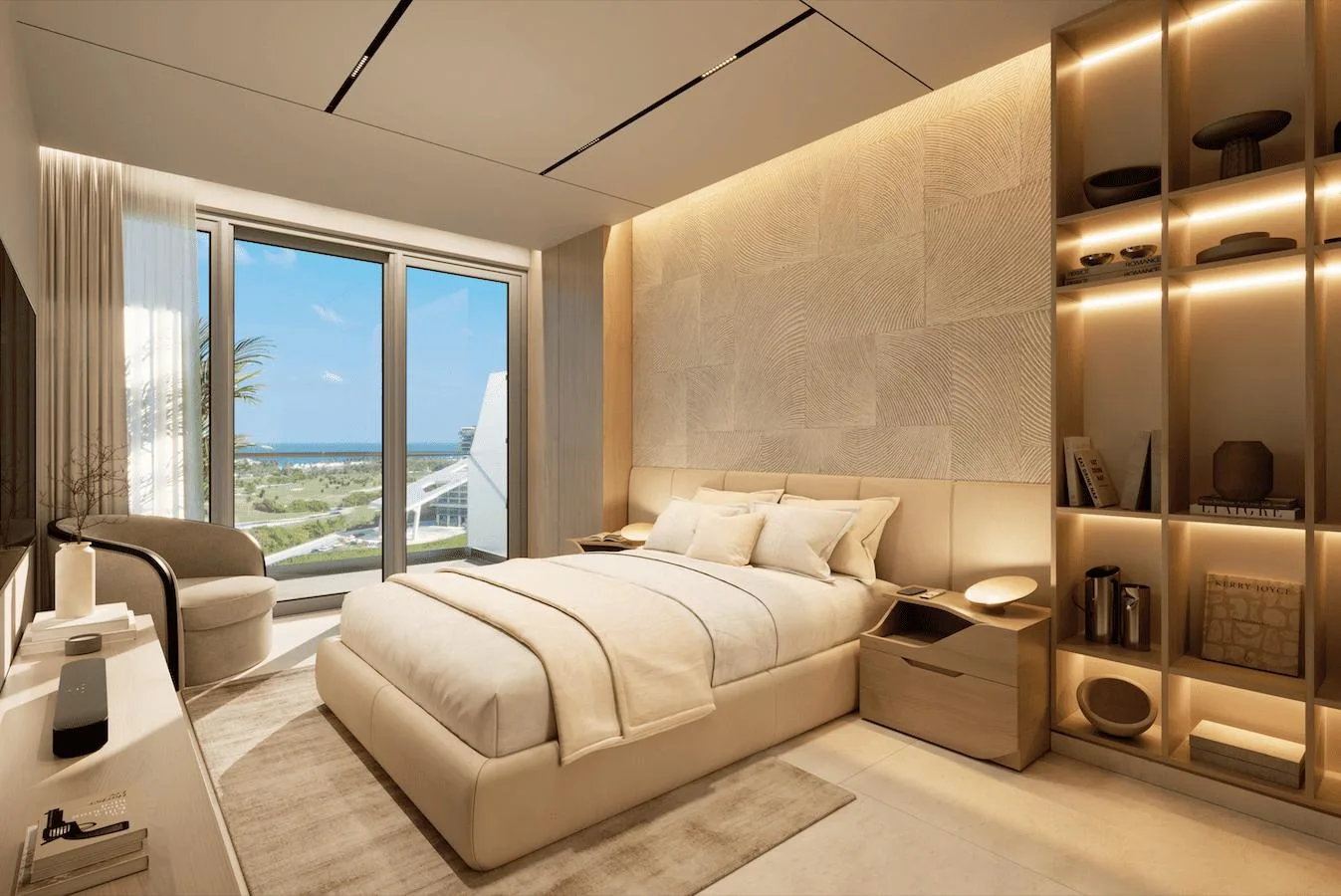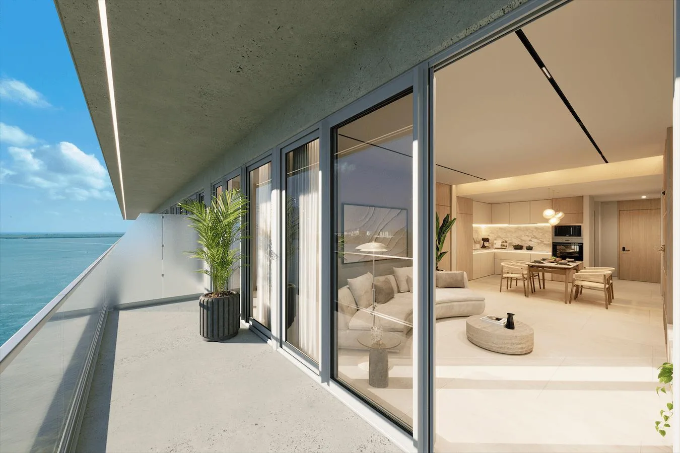 Building amenities include a beach club, a private marina, a pool area with a panoramic terrace, and a wellness space with a gym, spa, and cold plunge. Additional spaces consist of a meeting room, a playroom, and a cinema. There is a playground, a bar, and a pet garden. Covered parking, security, and additional services are available.
