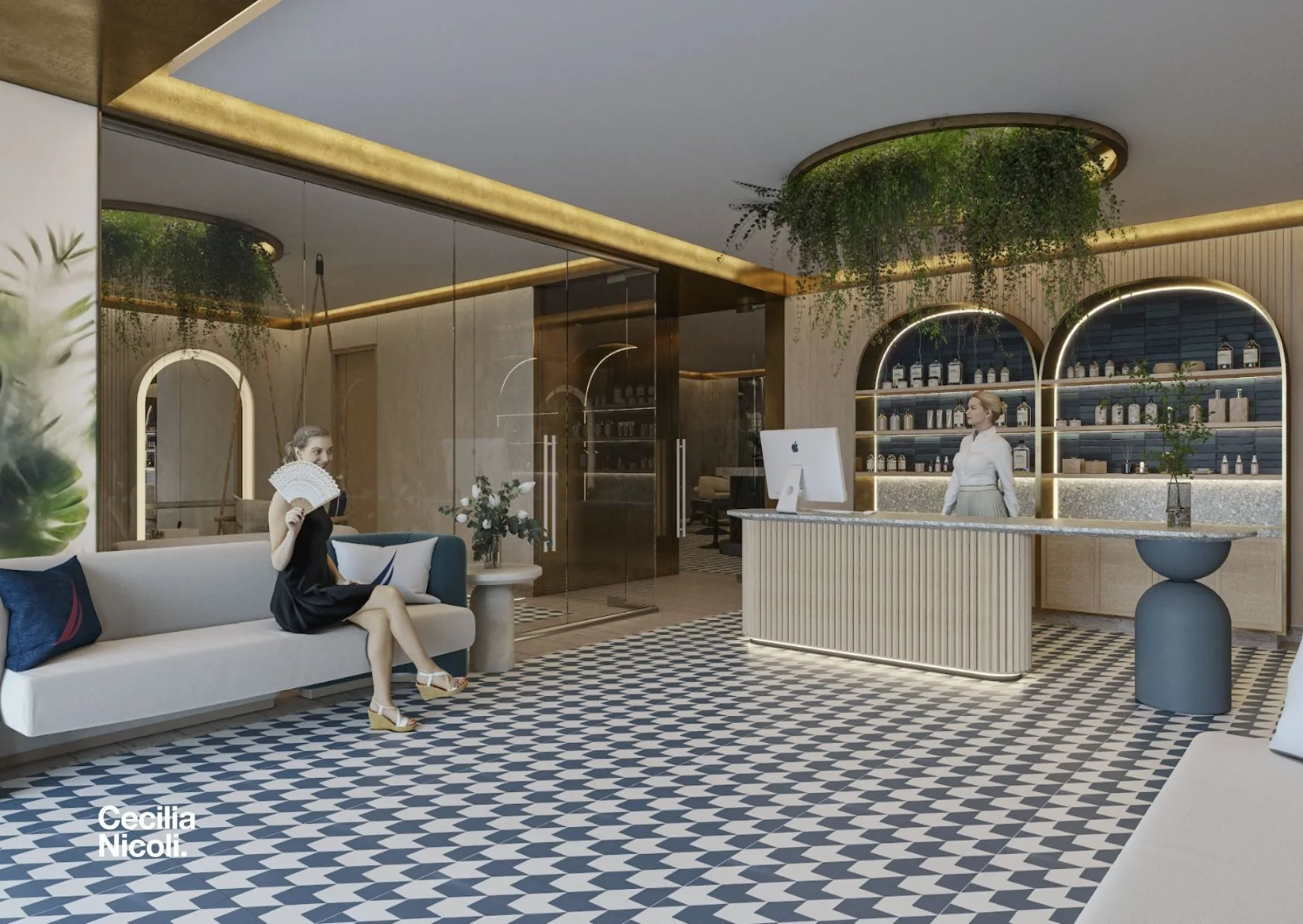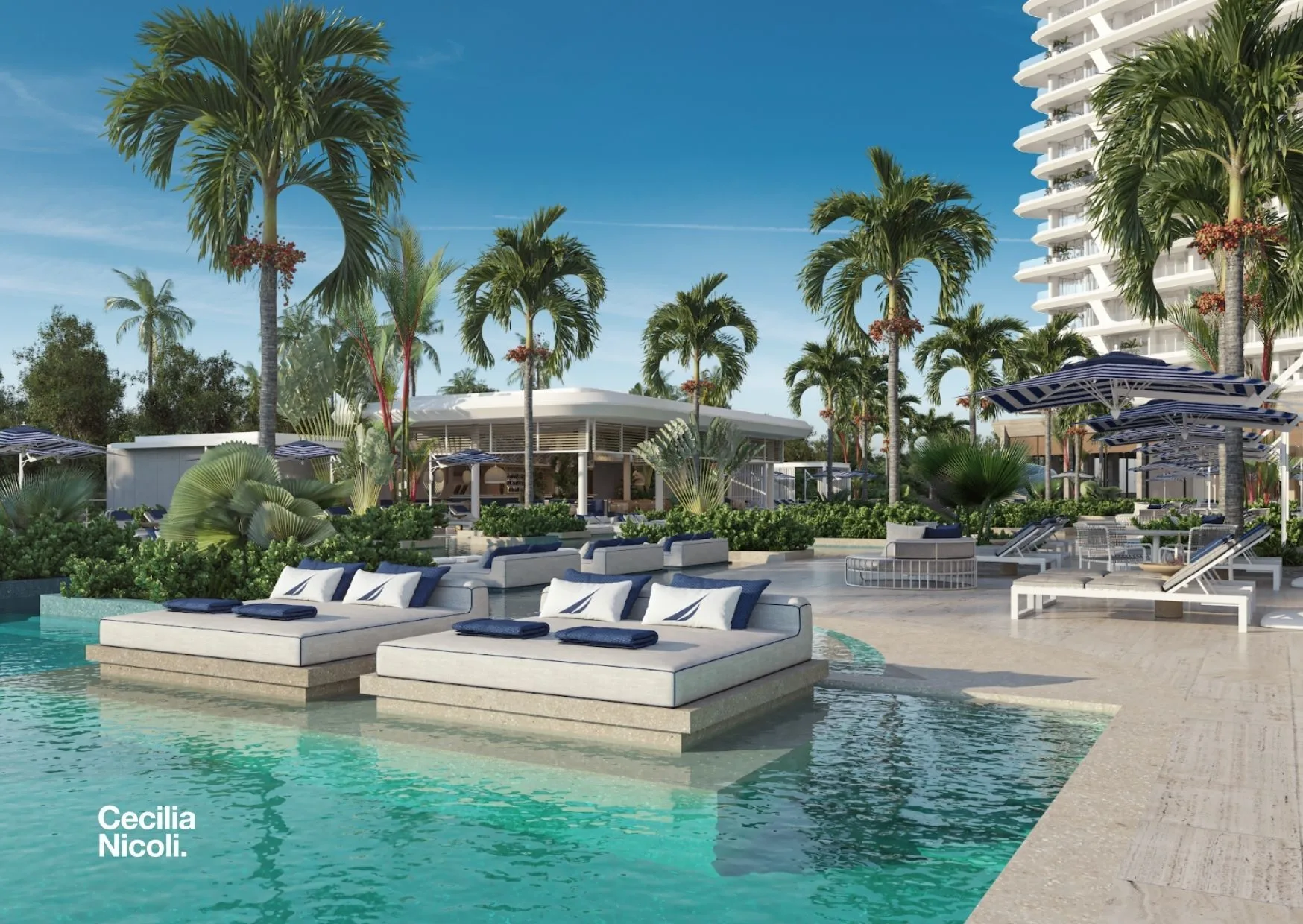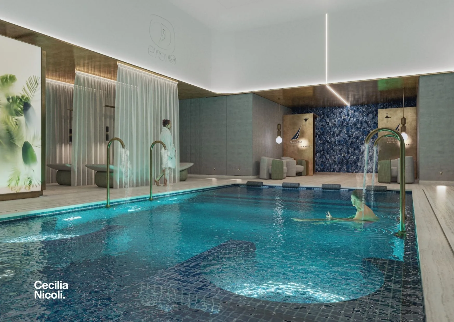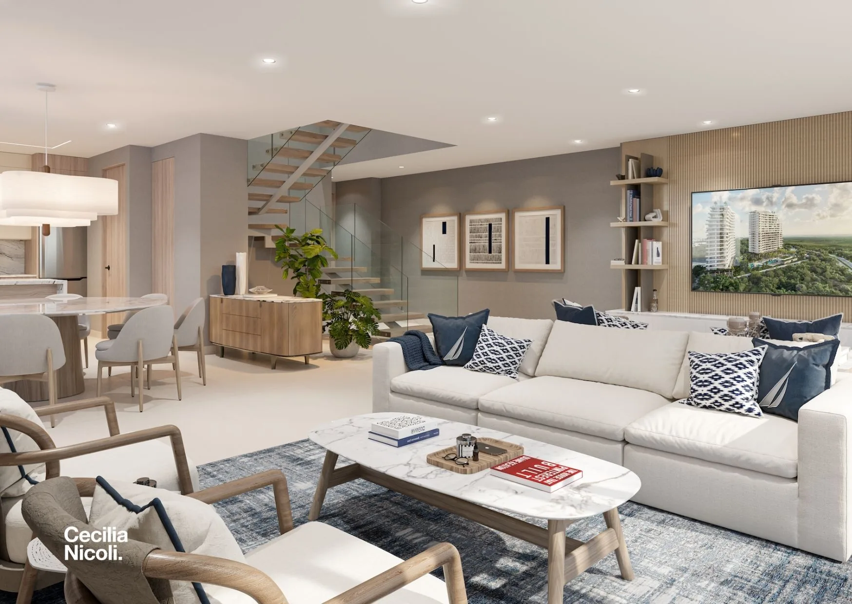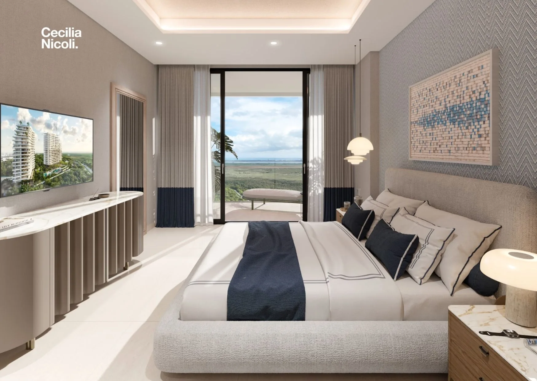 The property provides access to over fifty exclusive amenities. These include a Beach Club on Isla Blanca, sports courts, family swimming pools, and adult-only rooftop pools. Additional amenities consist of a swimming lane, a spa with a sauna and steam room, a cinema, a music hall, and a speakeasy bar. The development features restaurants and a cafeteria, co-working spaces, a pet spa, and valet parking with covered spaces.