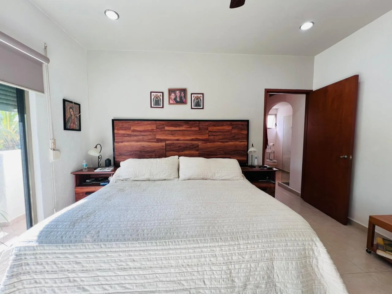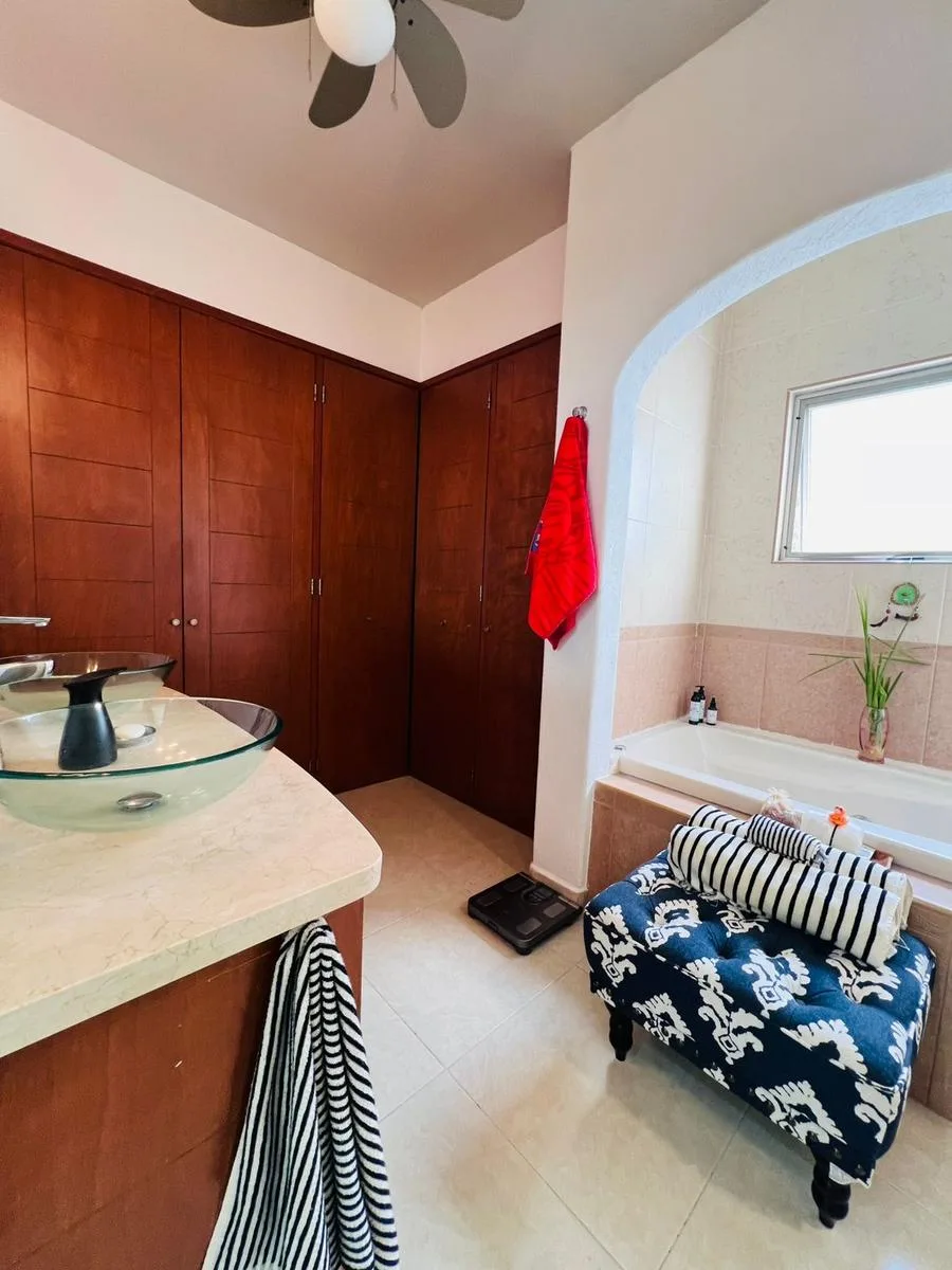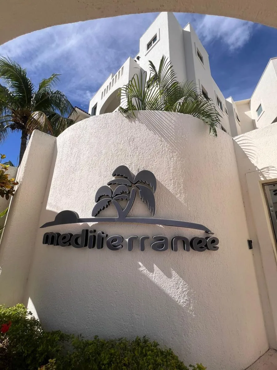 This apartment is located in the Residencial Mediterranee within Supermanzana 17. The layout includes a primary bedroom with an ensuite bathroom featuring a bathtub, and two secondary bedrooms. The bedrooms feature balconies with exterior views.