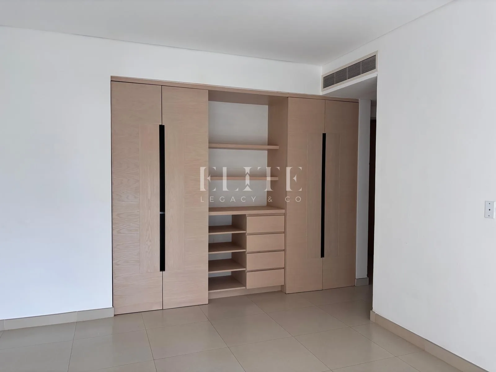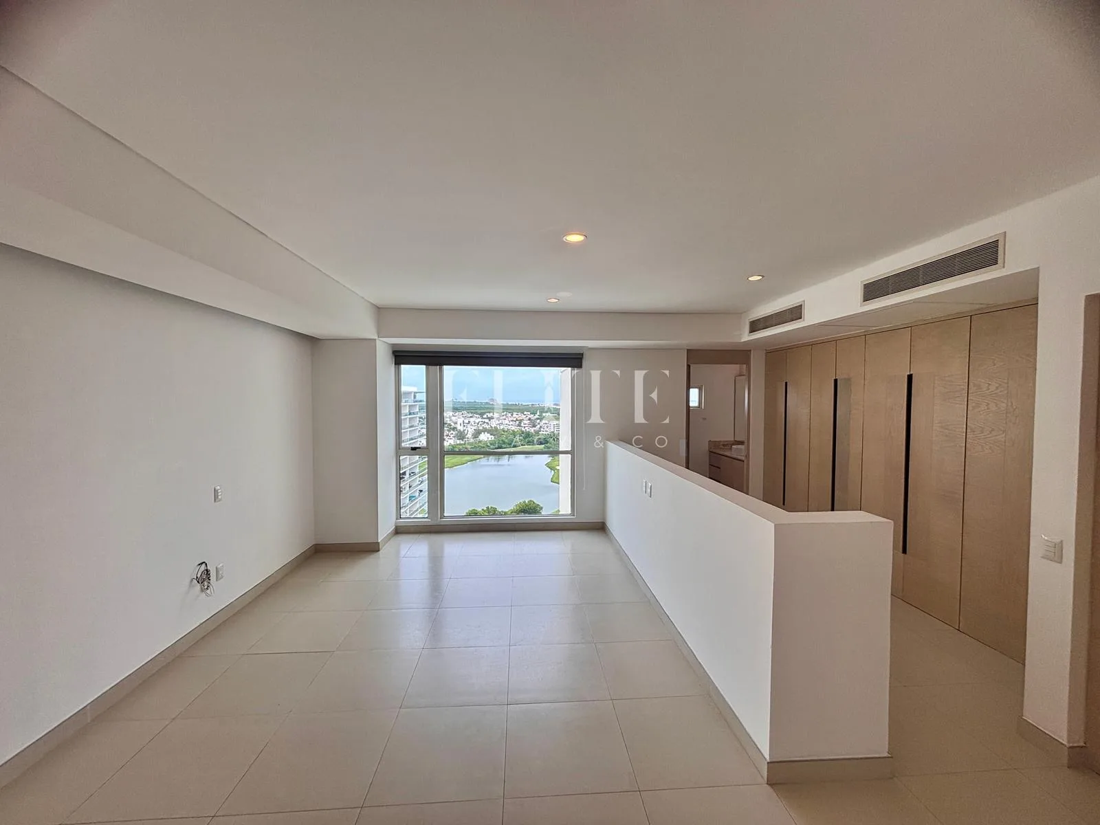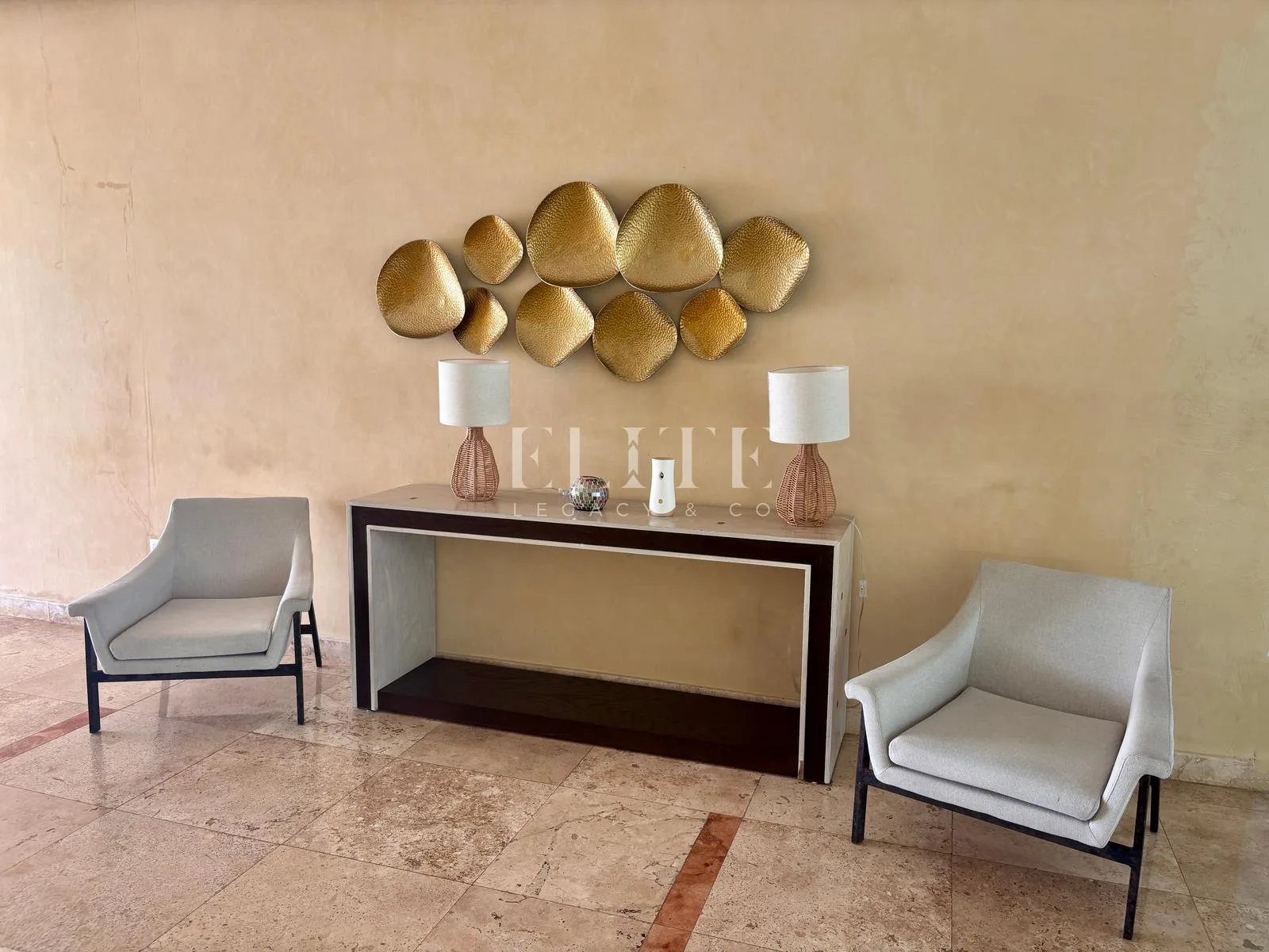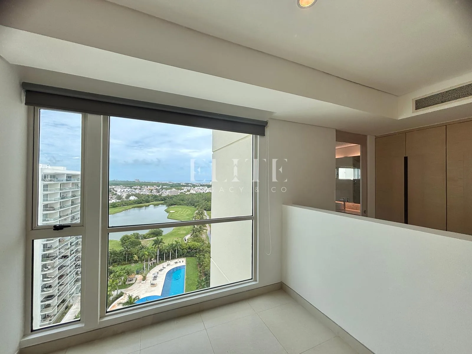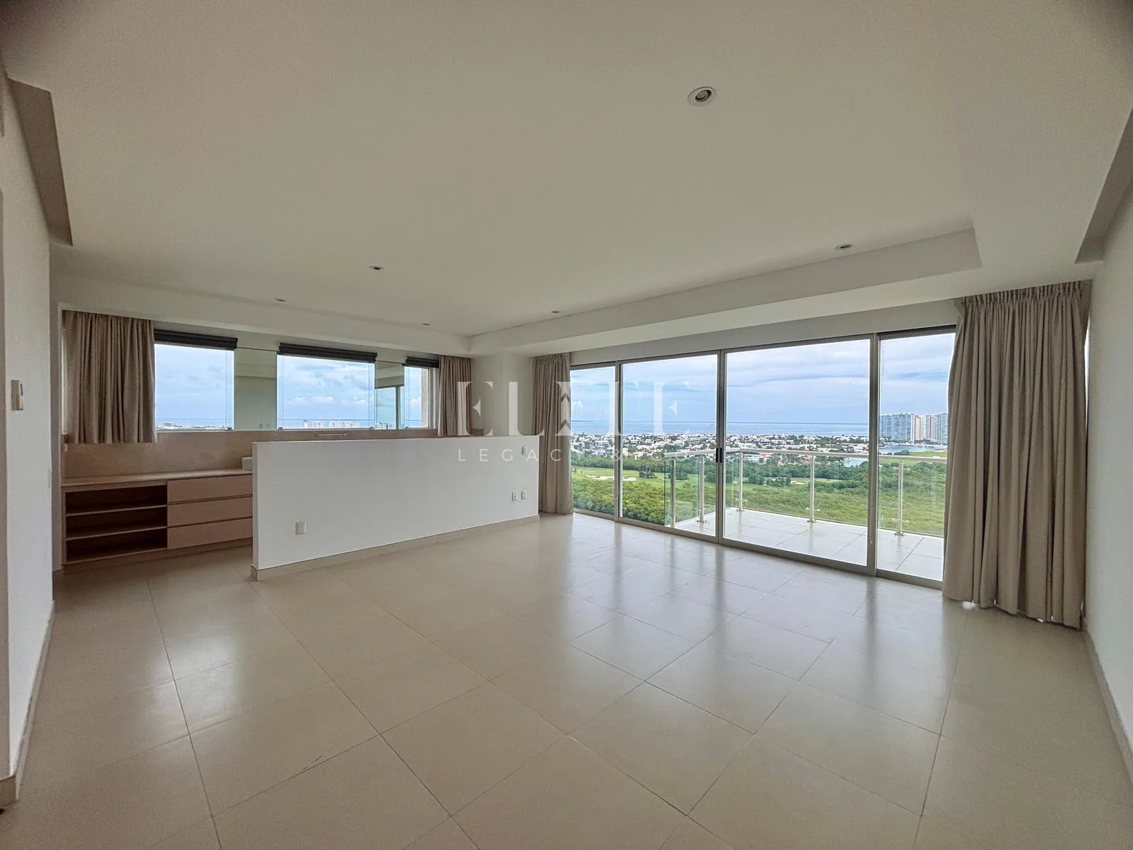 The apartment offers direct access from the elevators into a combined living and dining area. The integrated kitchen includes a breakfast bar and a pantry. A half bathroom is available for guests. A terrace presents views of the golf course, Puerto Cancún, and the Caribbean Sea. The master bedroom is equipped with a walk-in closet and a full bathroom. Two secondary bedrooms each include closets and full bathrooms. Additional space can be used as a TV room or office.