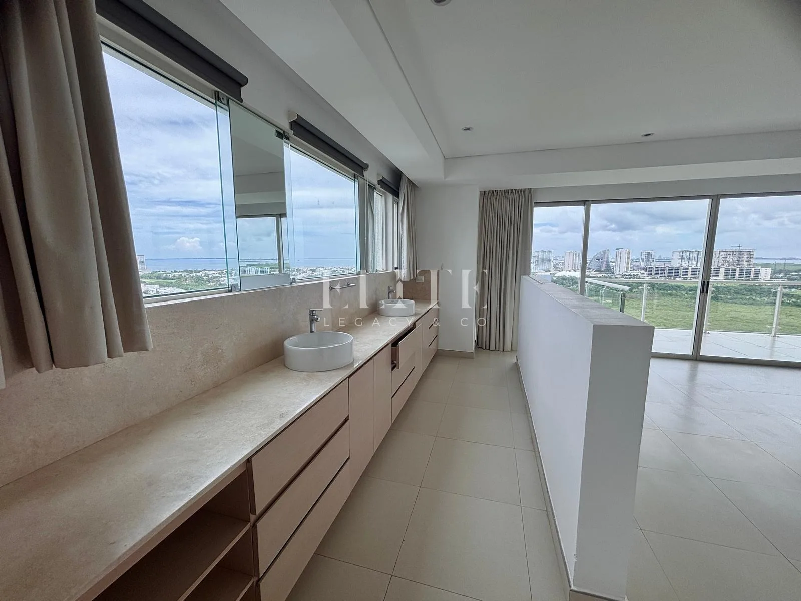 This elegant three-bedroom apartment is situated on Avenida Bonampak in Cancún, providing convenient proximity to the Hotel Zone, Puerto Cancún, and the city's main thoroughfares. The residence boasts direct views of the Caribbean Sea from the living room, dining room, and master bedroom. It features spacious layouts, abundant natural light, and contemporary finishes throughout.