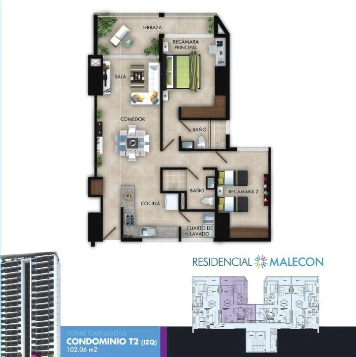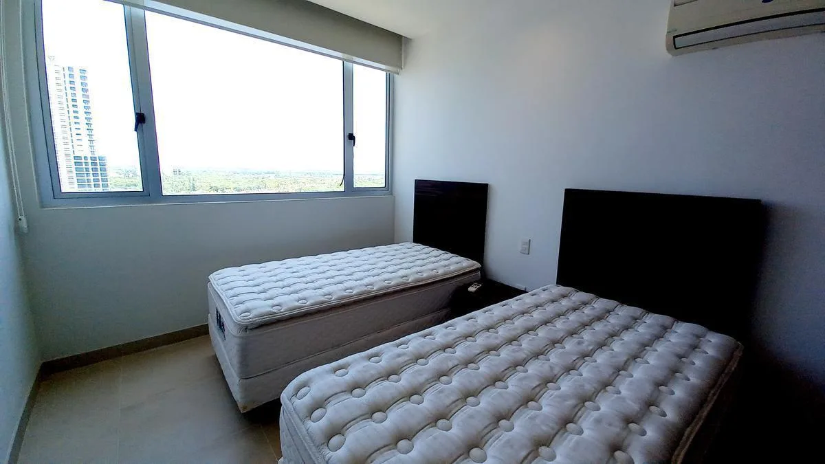 The apartments feature views of the sea and the lagoon. They are located in a tower within the Malecón Américas residential and commercial complex.