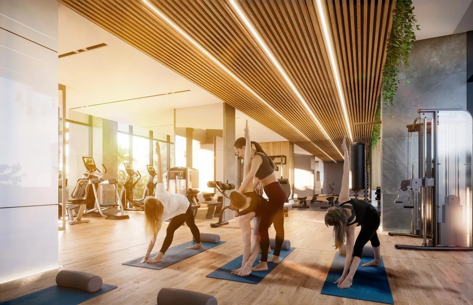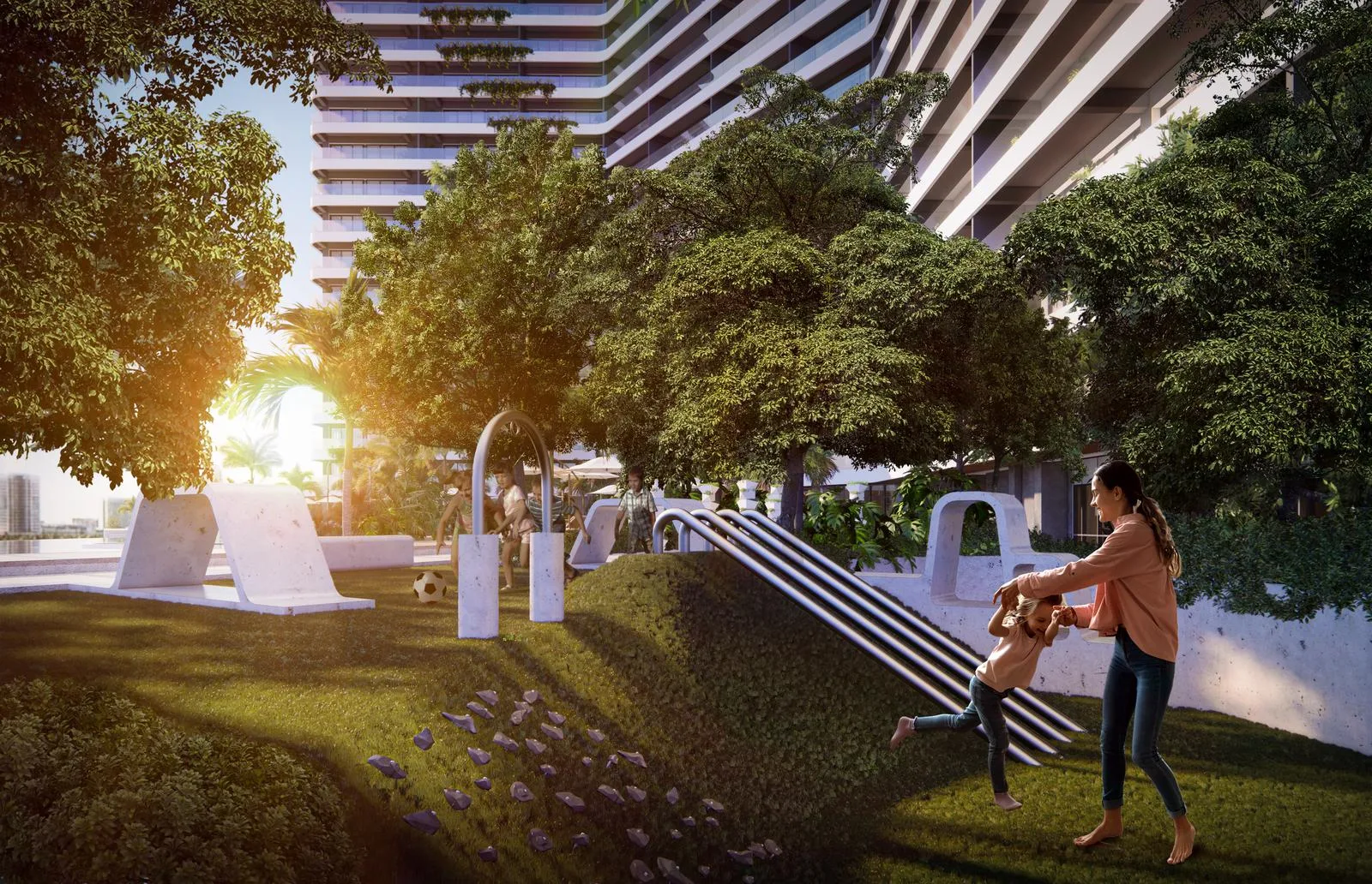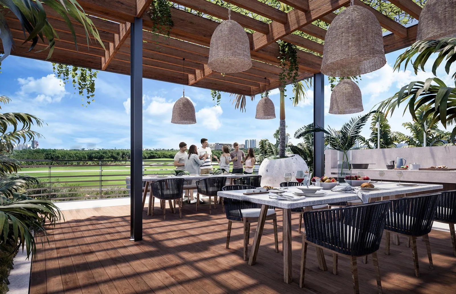 The development includes a semi-olympic pool and separate children's pools. A kids club is available with both outdoor and indoor areas. Additional amenities consist of a spa, steam room, gym, dance hall, sport bar, and grill.
