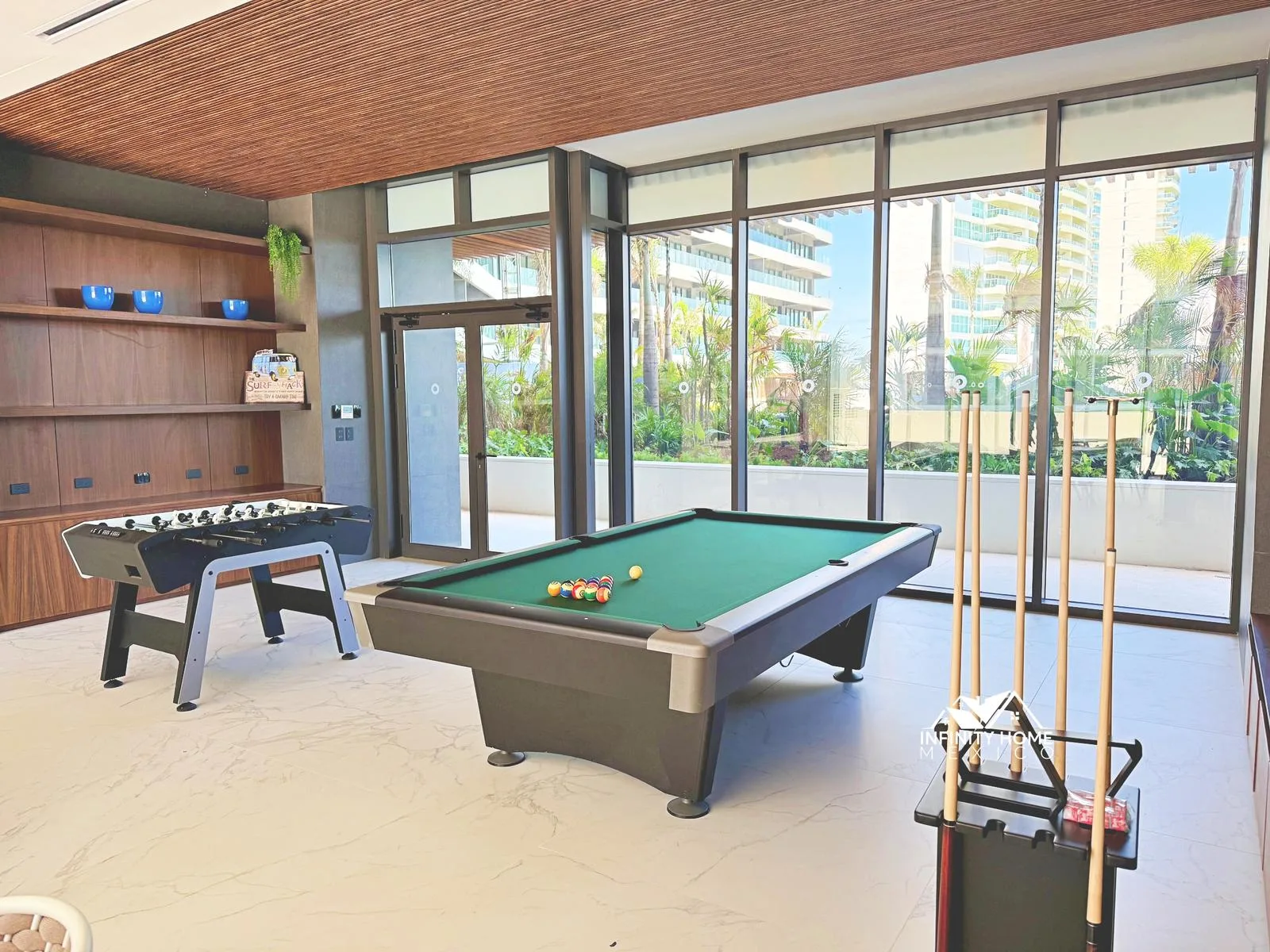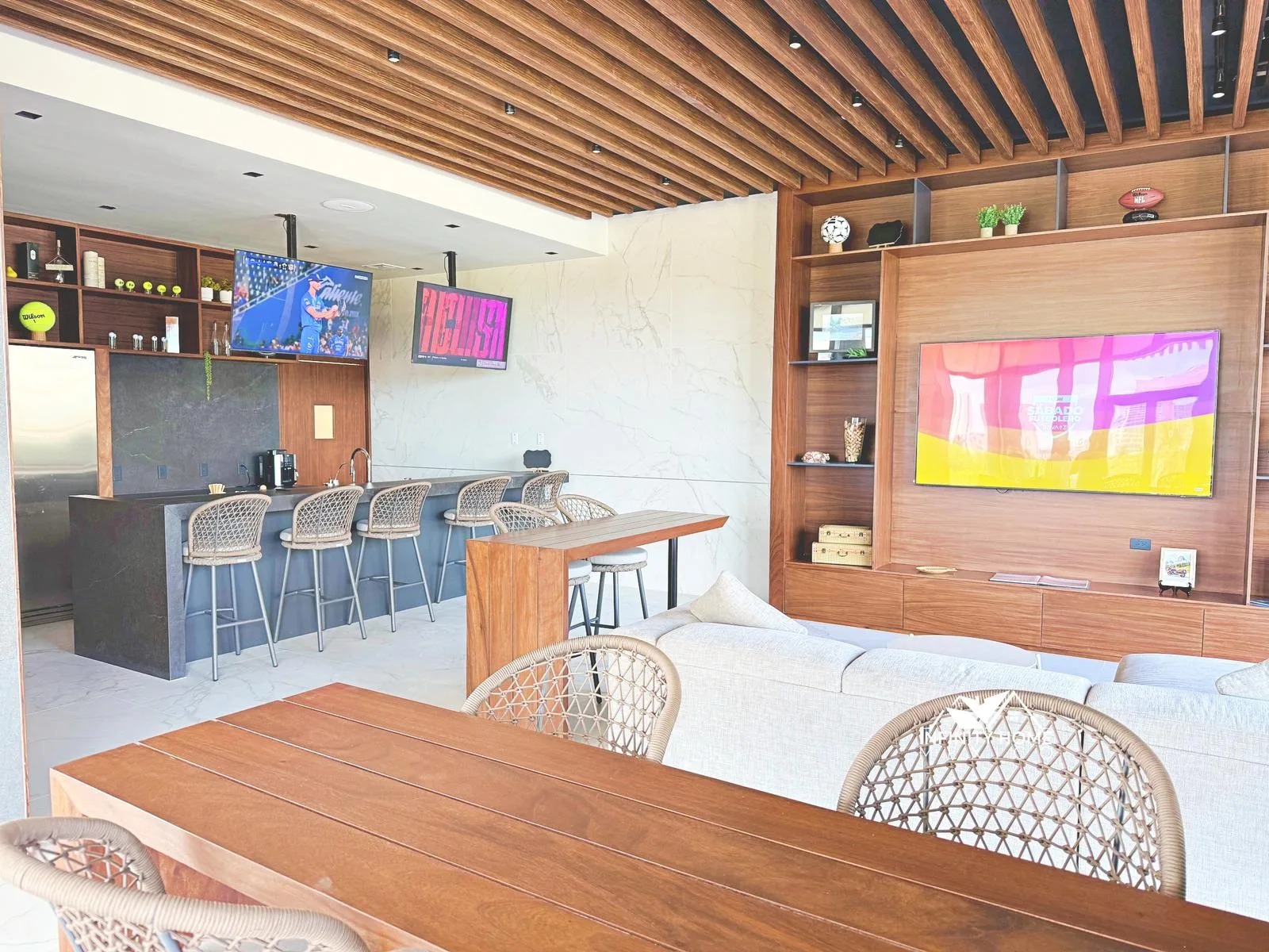 The building offers multiple amenities for residents. A sports bar features dual TV areas with indoor and outdoor seating overlooking the gardens. A dedicated 200-square-meter pet area is fully enclosed with play equipment and benches. A teens club includes foosball, billiards, video games, and a TV zone. Wellness amenities include a spa, a yoga deck, a semi-Olympic swimming pool, and a gym. A concierge service is available.