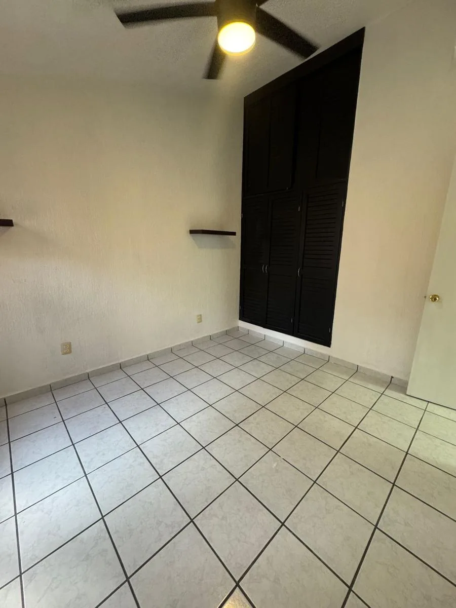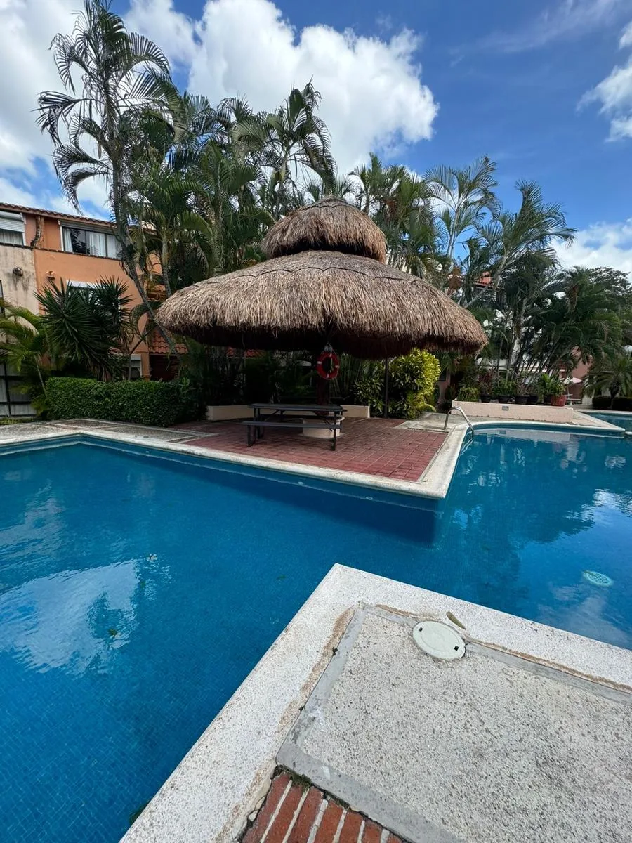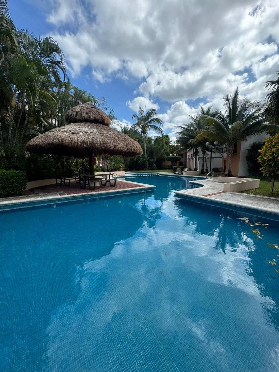 Residential amenities offer covered parking for two cars, a 24/7 security booth, a communal pool, a palapa, and sunbeds. The property is situated in the central SM 18 area.