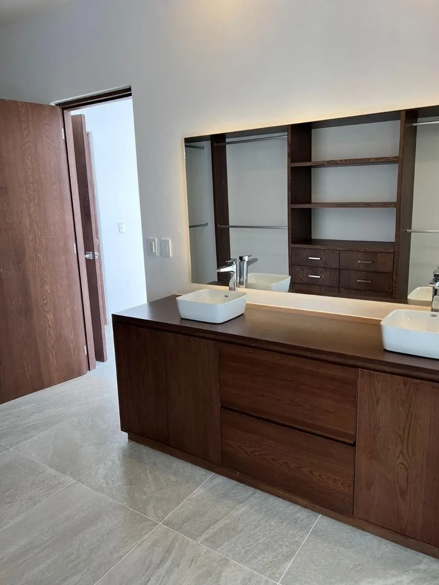 The residence features three bedrooms, each with its own private bathroom. The layout includes a living room, a dining area, and a kitchen. A separate TV room and a dedicated bar area are also provided.