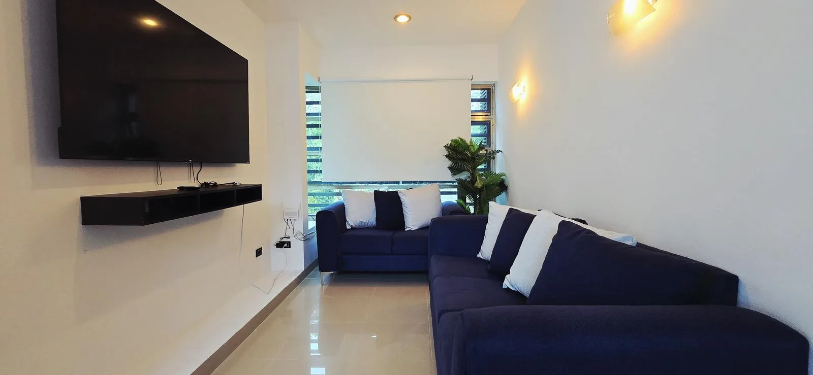 Inside, there are three bedrooms, two of which are on the ground floor, each with a bathroom and walk-in closets. A separate TV room is also provided.