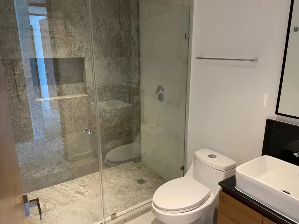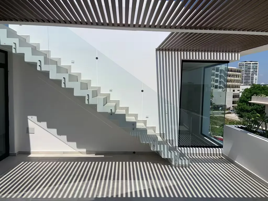 The second level is dedicated to the master suite. The suite includes two private terraces with views of the Hotel Zone and Laguna 1, a full bathroom with a double sink and independent shower, and a large walk-in closet. It provides direct access to a private rooftop.