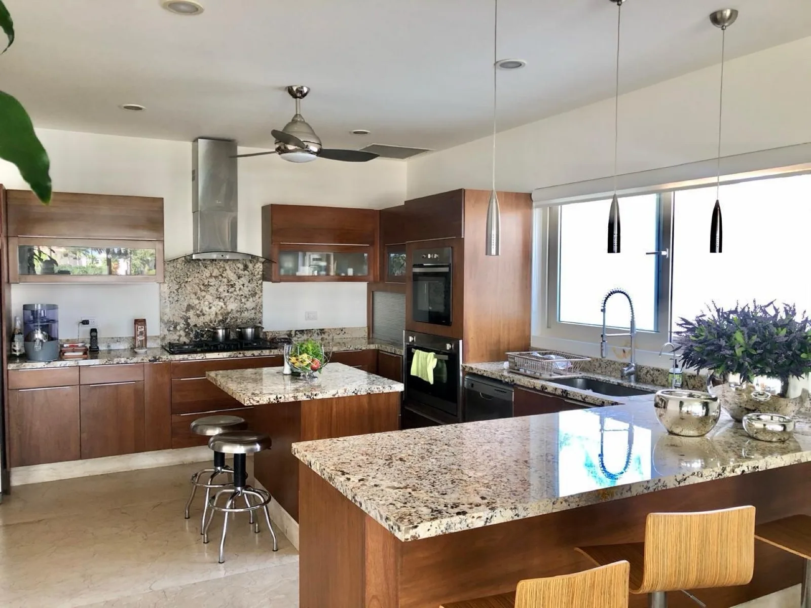 The house is equipped with German anti-cyclonic windows, central air conditioning, an ambient audio system, an electrical substation, climate-controlled walk-in closets, a water heater, a stationary gas tank, a pool filtration system, and a water tank with a hydropneumatic system and water softener.