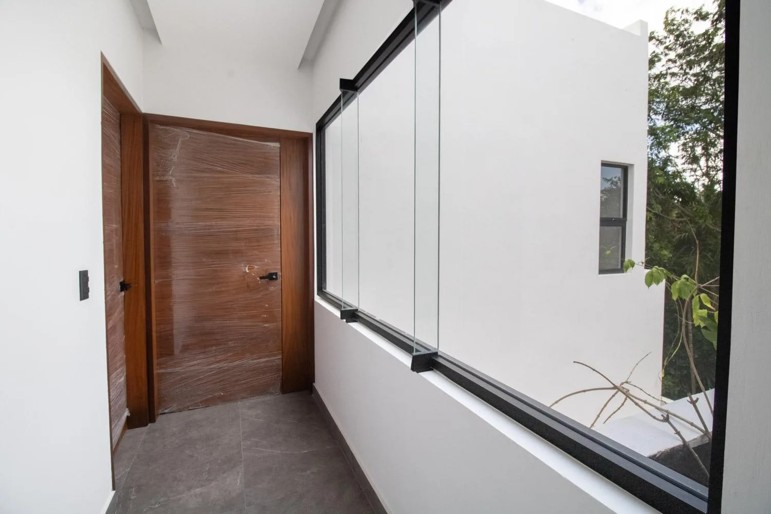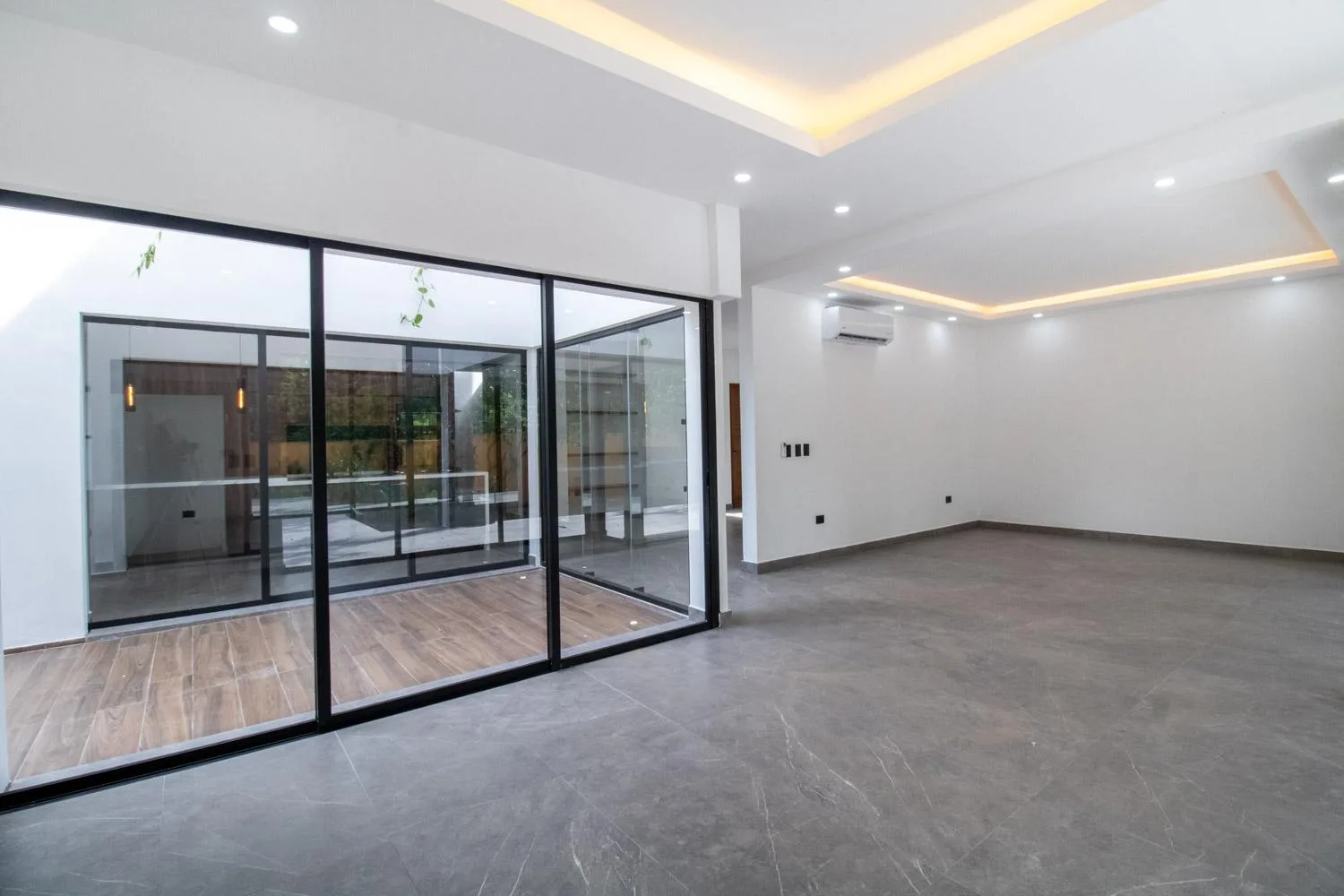 The first level of the residence comprises a living and dining room, an interior garden with glass and natural light, a fully equipped kitchen, and a pantry with ample cooking space. There is a family room with a full bathroom that can be used as a fourth bedroom, a half bathroom for guests, a pool with a social terrace and an exterior half bathroom, a basement suitable for storage or a game area, a laundry room, a service room with independent access, and covered parking for two vehicles.