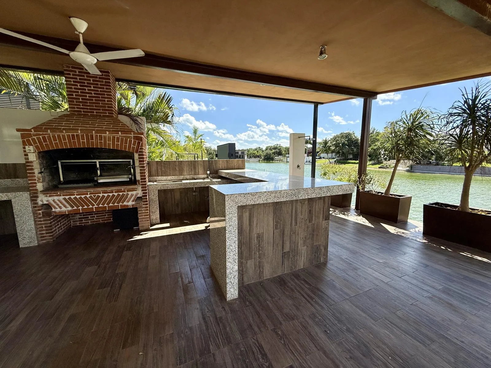 The land size is 970 square meters with a construction area of 750 square meters. It is situated on a quiet private street, offering privacy and lake views with direct access from the patio.