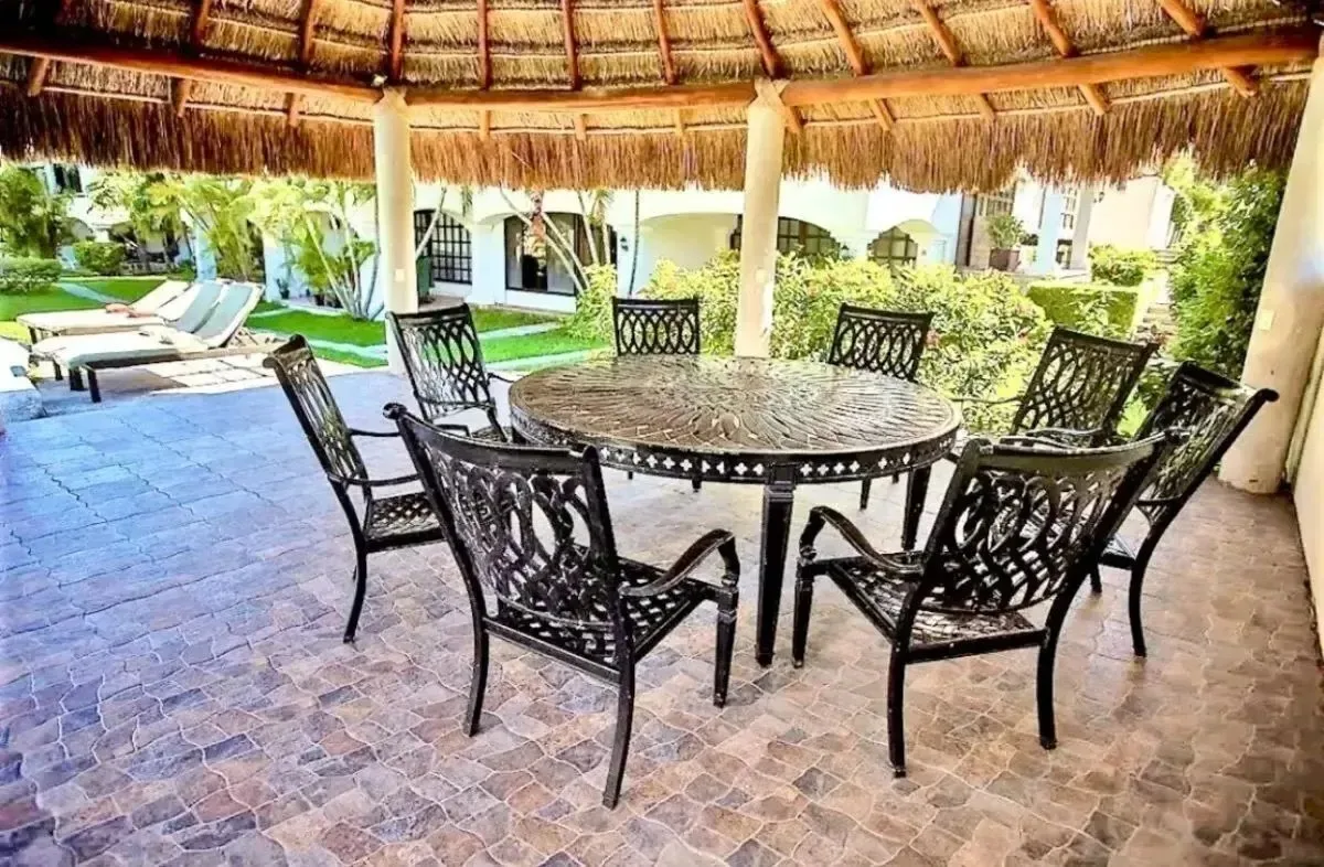 The community features three swimming pools for recreation. The grounds include well-maintained gardens and a palapa for relaxation and social gatherings.