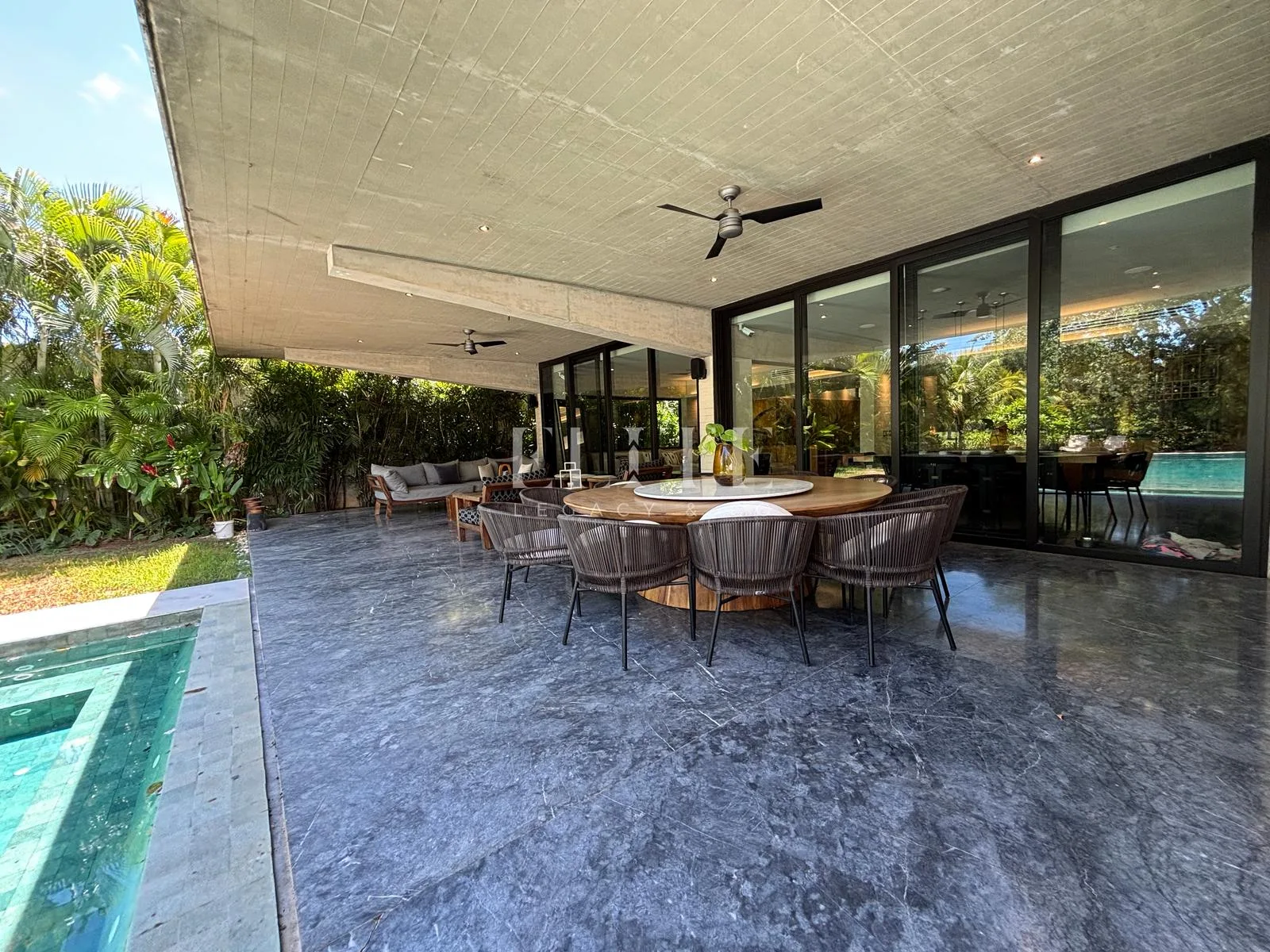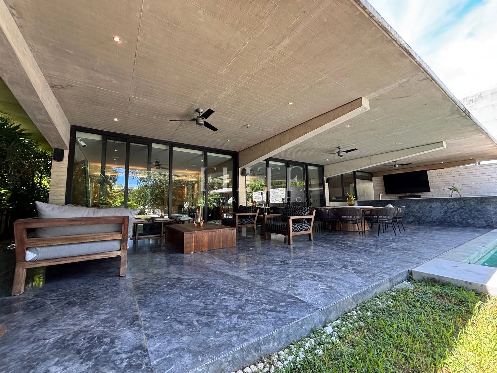 The house includes four bedrooms, a private cinema and bar, a fully equipped gym, and an infinity pool surrounded by green areas. It is furnished with custom-designed pieces.