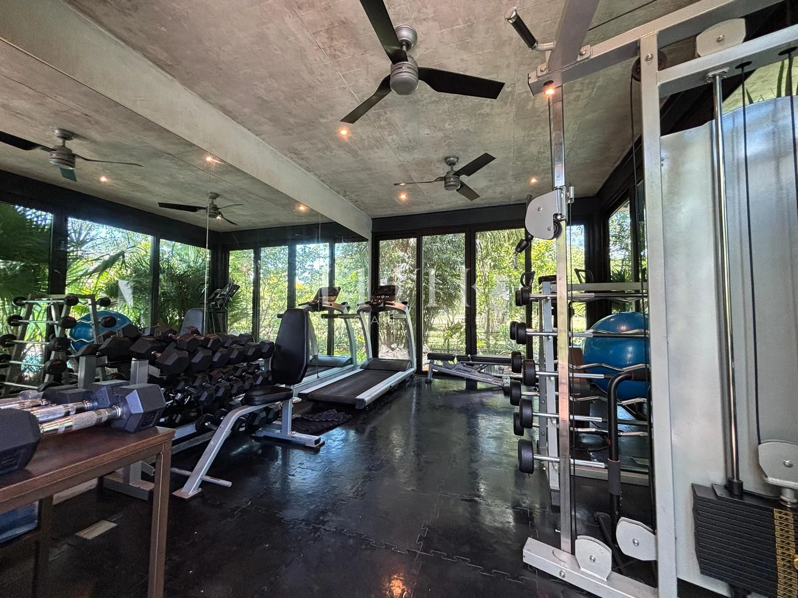 On the first level, there is a living and dining room, a fully equipped kitchen, a pantry, and a guest half-bathroom. A fourth guest bedroom with a full bathroom is also located on this floor. The covered terrace features a sitting and dining area, a pool with a jacuzzi, and a bar area with a refrigerator, TV screen, and audio system. An exterior half-bathroom, an equipped gym, a service room, a service hallway with two storage rooms, and covered parking for eight cars complete this level.