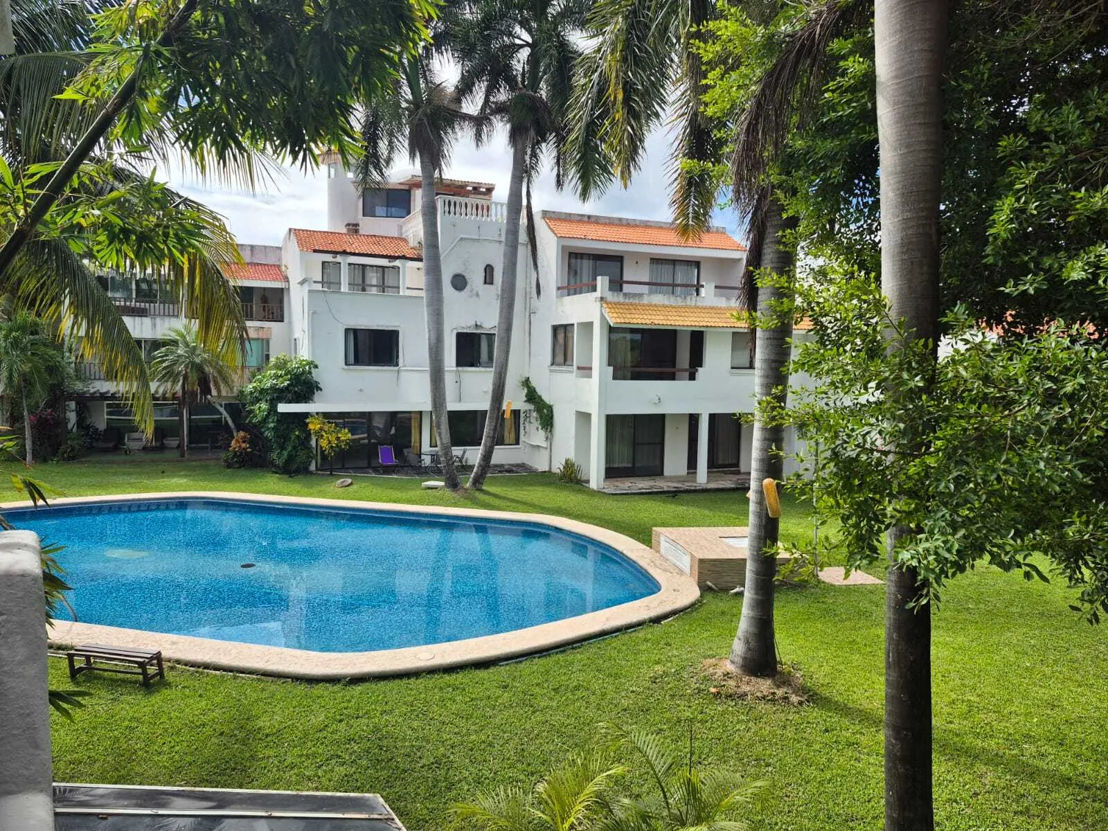 This house is situated on a corner lot within a condominium in the Hotel Zone (Pok Ta Pok). It offers views of the golf course and provides access to a common area with a swimming pool.