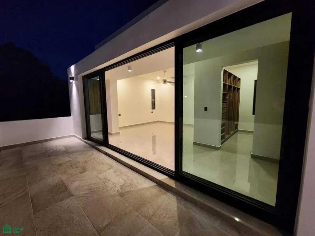 The home features four bedrooms. The living and dining room includes large windows. The kitchen is fully equipped and features high-quality finishes. The property includes a private garden and pool, along with a three-car garage.