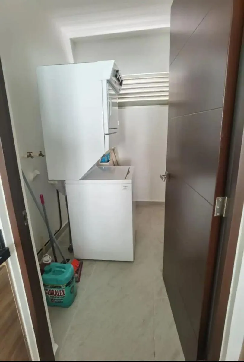 The house features a fully furnished living room, dining room, and kitchen. The kitchen is equipped with a stove, oven, electric oven, microwave, fryer, blender, complete dinnerware, glassware, and kitchen utensils. It includes a laundry center with a washer and dryer, a 65-inch television, linens for beds and the pool, mosquito nets, blackout and translucent roll-up blinds, a service door, and a garden table.