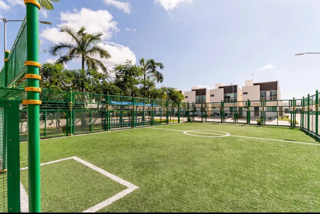 The community offers 24/7 security with a double access filter. Amenities include a gym, a common pool, a children's play area, a soccer field, and extensive green areas.