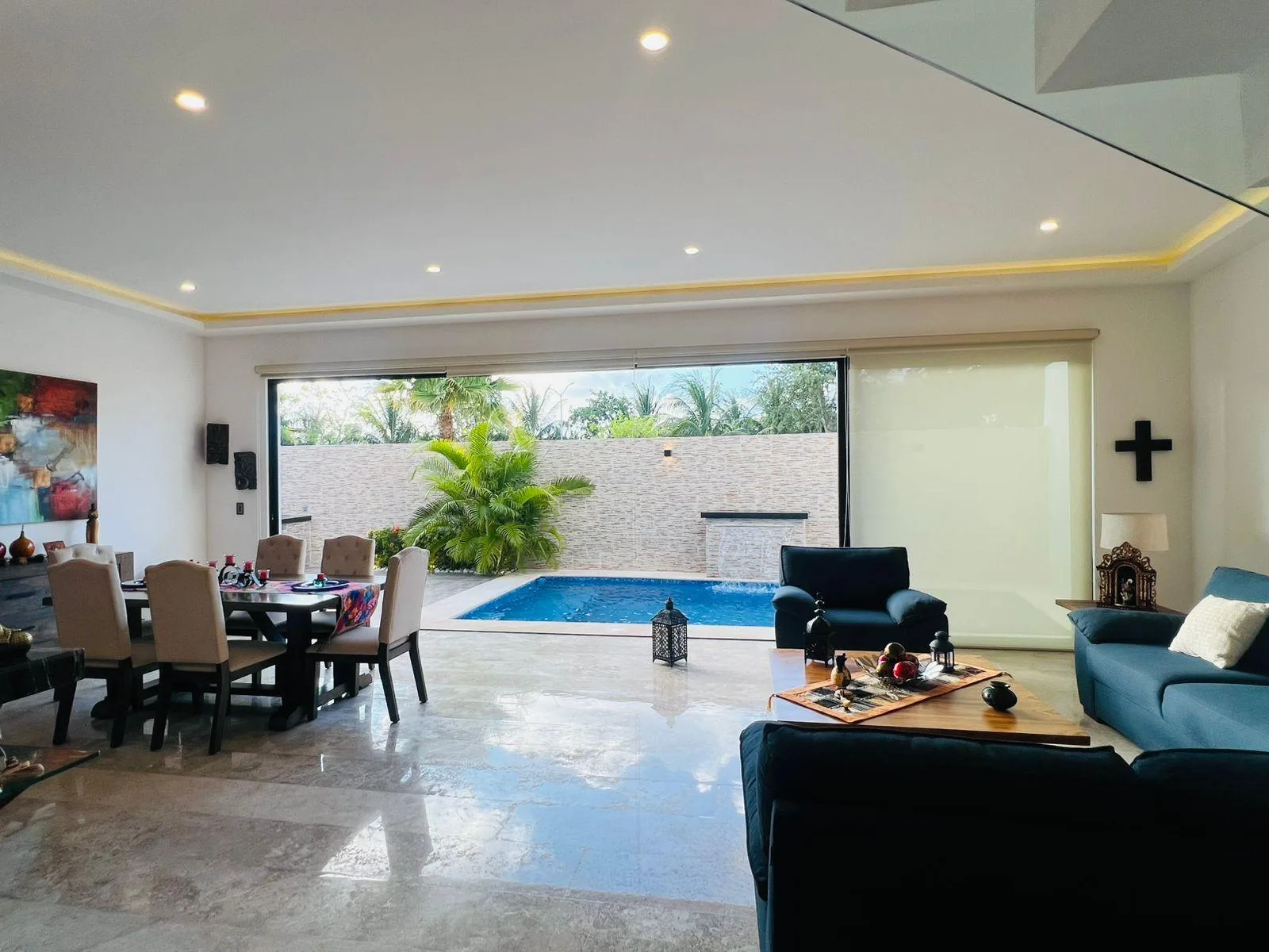 This house is located in the Residencial Rió community. The ground floor features an equipped kitchen with a granite breakfast bar, a living room, and a dining area. This level also includes one bedroom with a full bathroom, a service room, and a laundry area. It opens to an outdoor area with a swimming pool featuring a waterfall, a full bathroom, and a terrace. Parking is available for three cars.