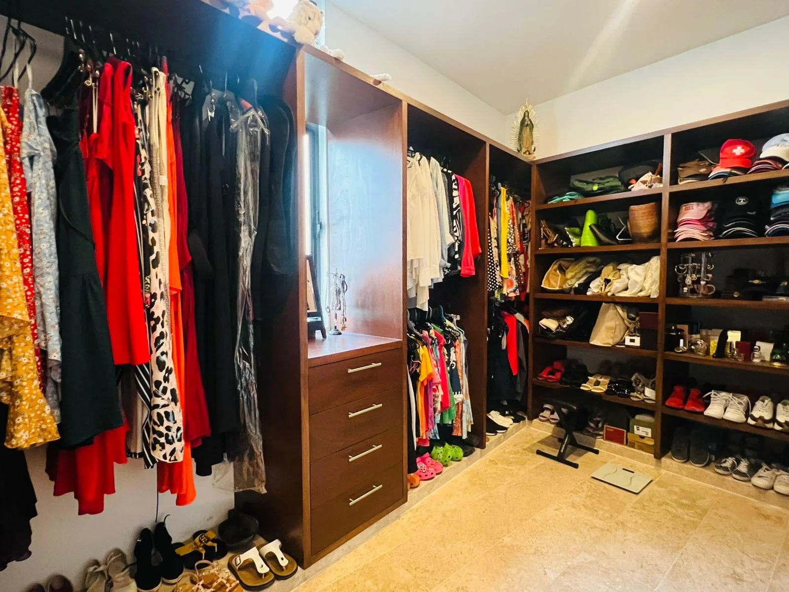 The first level contains the primary bedroom, which includes a walk-in closet, a full bathroom, a linen closet, and a private terrace. Two additional bedrooms on this level each have a walk-in closet and a full bathroom.
