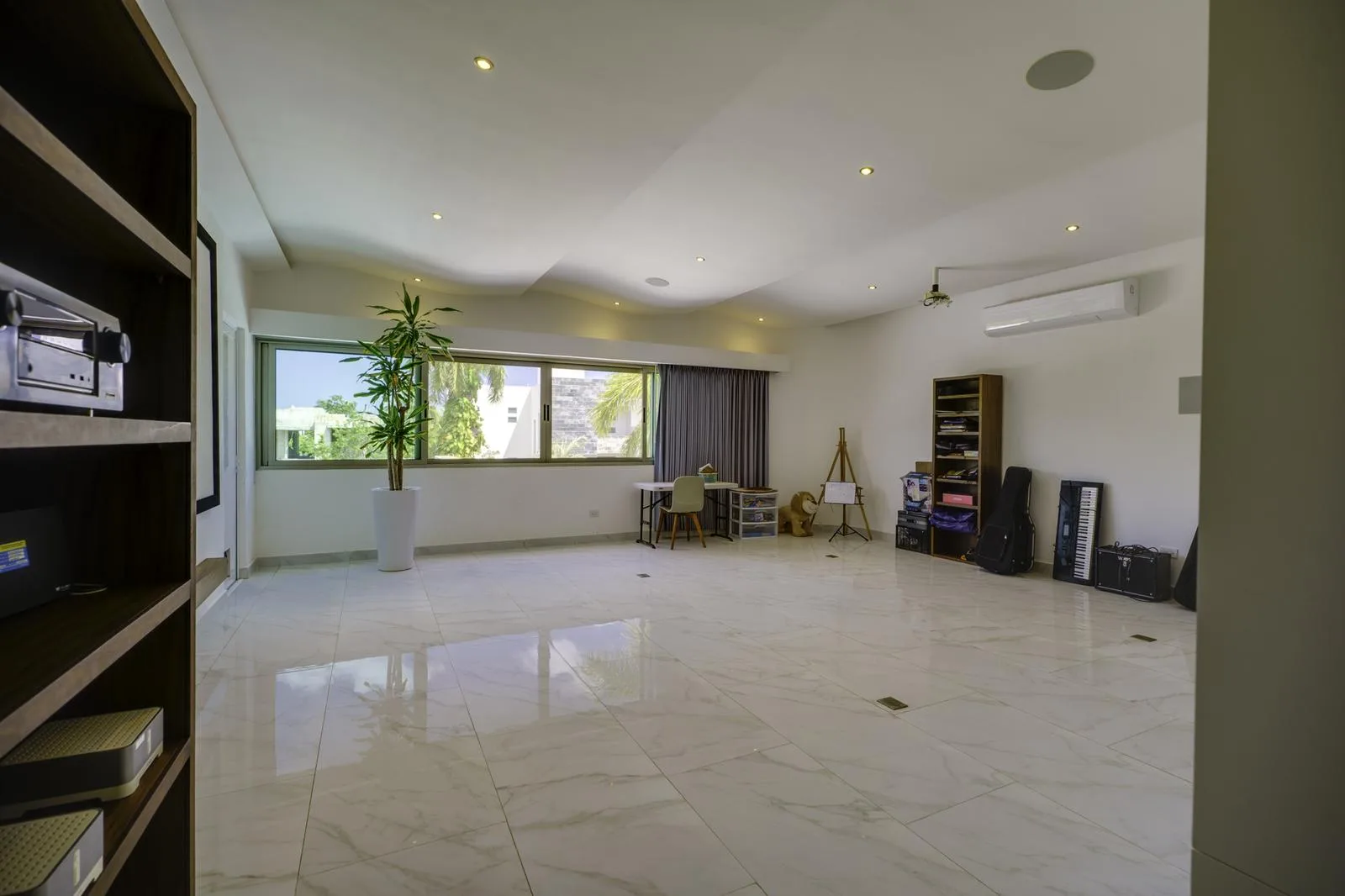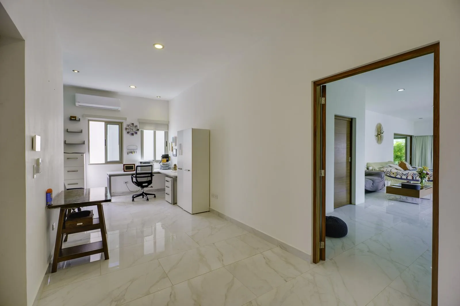 On the upper floor, the primary bedroom boasts a private terrace, a full bathroom with double sink, a tub, and a spacious walk-in closet. Two additional bedrooms each have a private bathroom, air conditioning, and terrace access. This floor also contains an office with a terrace, a family room, and an additional kitchenette.