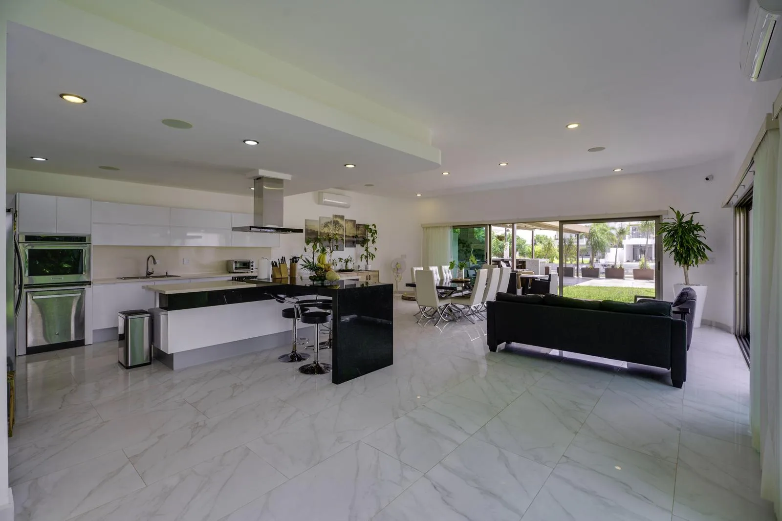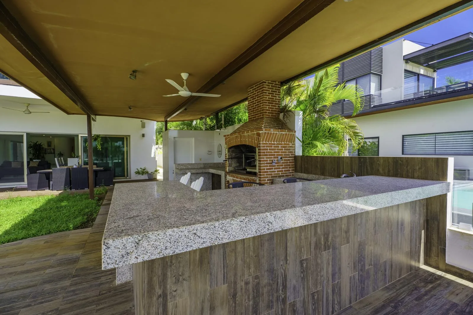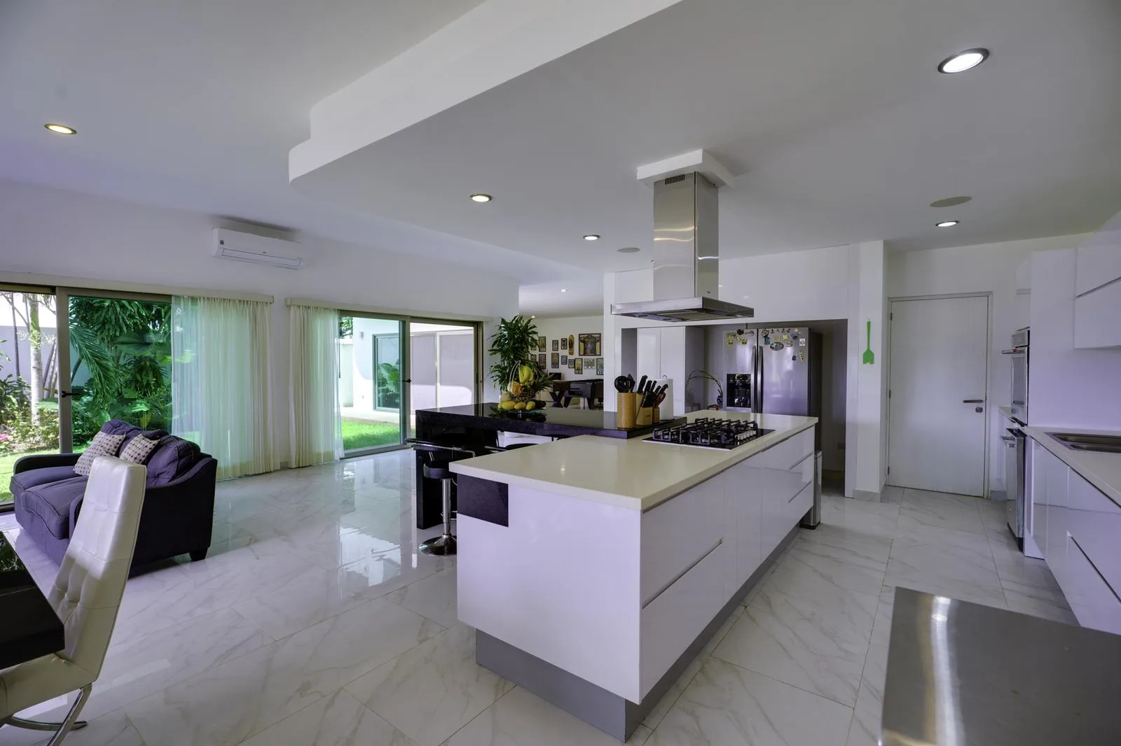 The ground floor includes independent living and dining rooms, a half bathroom for guests, and a kitchen equipped with a black granite bar and white quartz. Also on this level are a guest room with a private bathroom, a service room, a laundry area, and an outdoor area with a pool, garden, and a covered grill space.