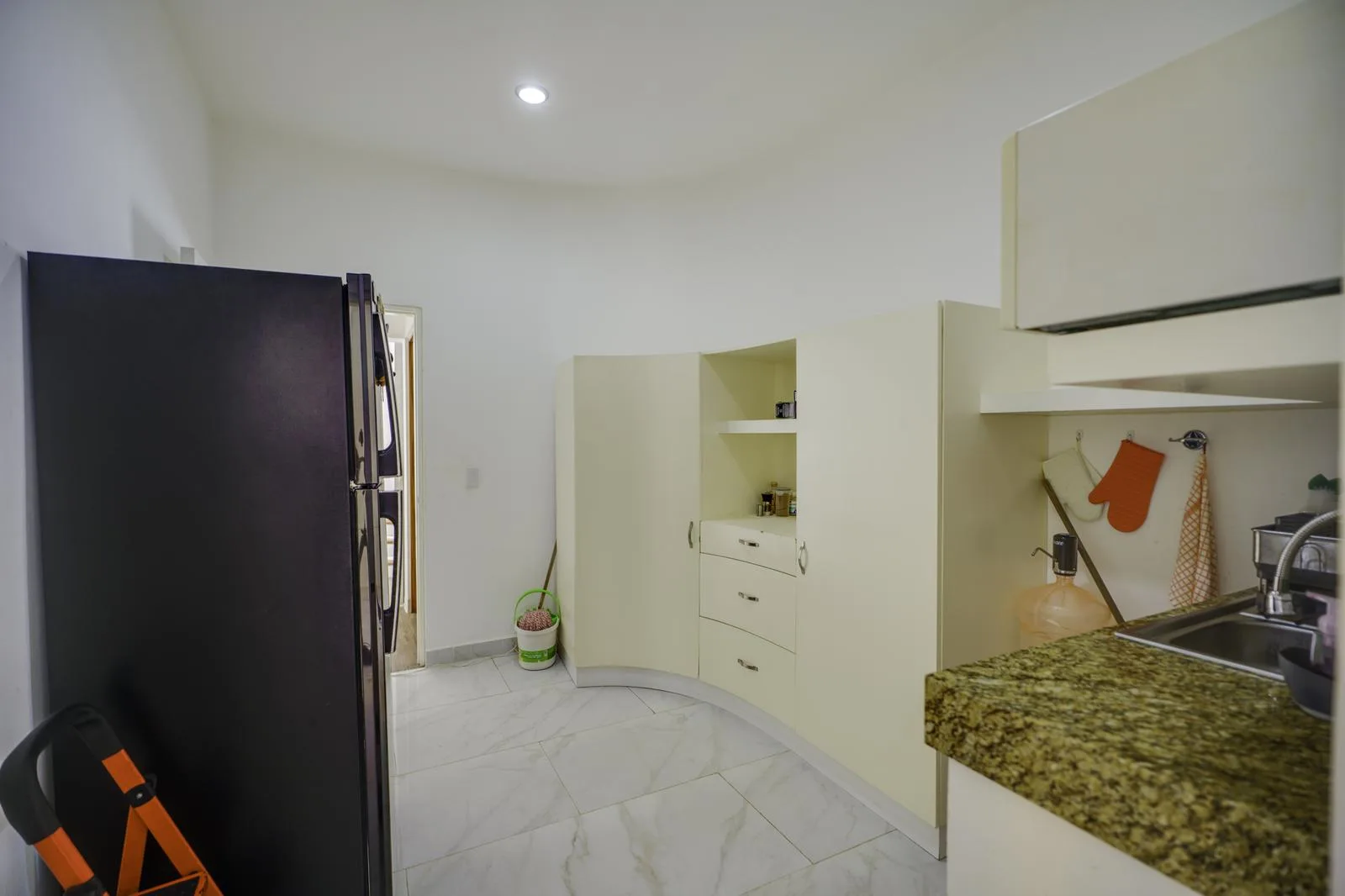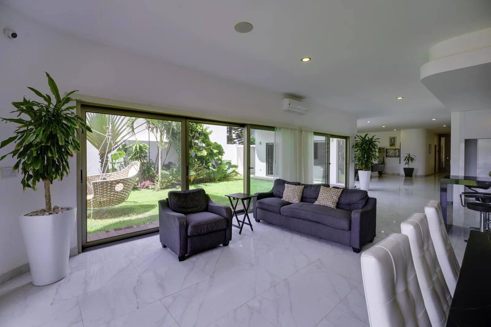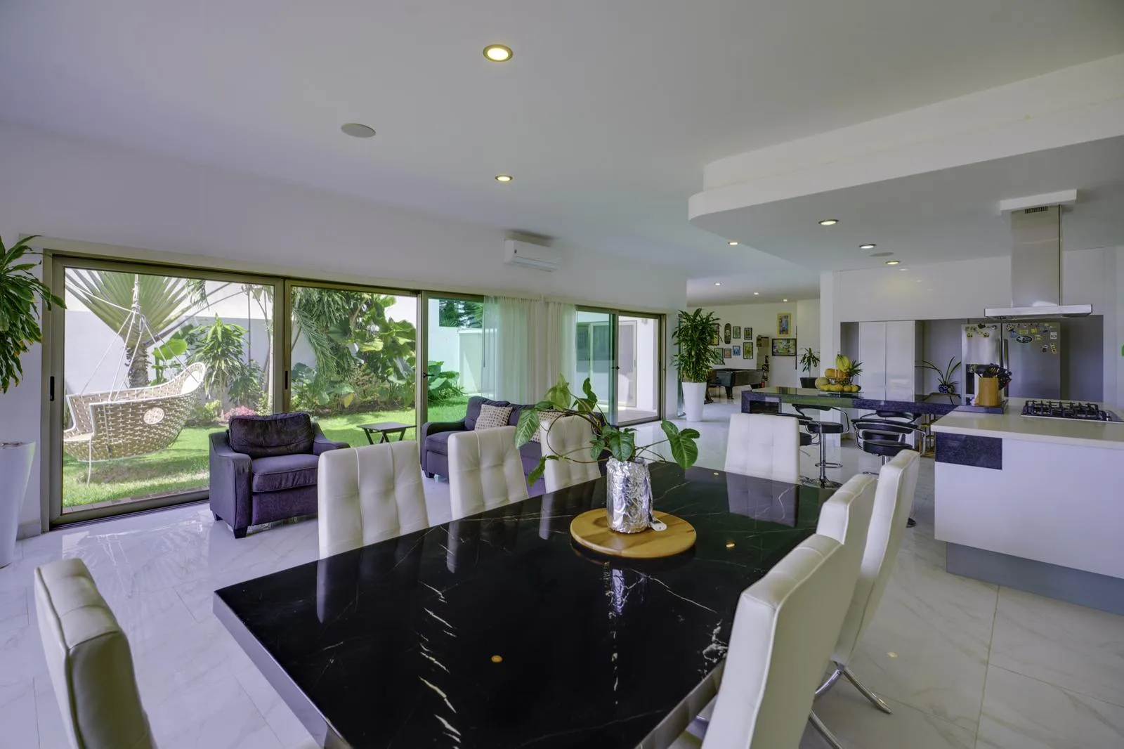 The ground floor includes independent living and dining rooms, a half bathroom for guests, and a kitchen equipped with a black granite bar and white quartz. Also on this level are a guest room with a private bathroom, a service room, a laundry area, and an outdoor area with a pool, garden, and a covered grill space.