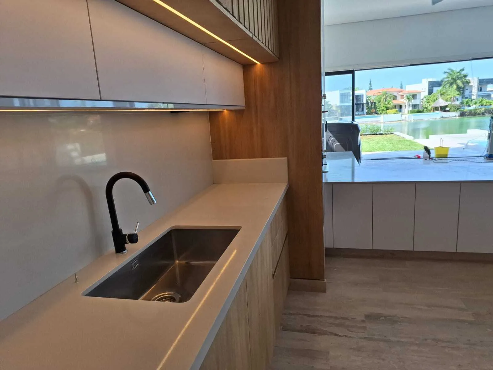 Upon entry, you are greeted by bright and spacious areas that invite relaxation and entertainment. Designed with elegance and functionality in mind, the kitchen features a central island, premium appliances, ample cabinetry, and all the necessary luxuries for enjoying life. From the kitchen, the energy flows with a beautiful view of the lagoon, providing a perfect setting for preparing favorite meals while admiring the tranquility of the surroundings.