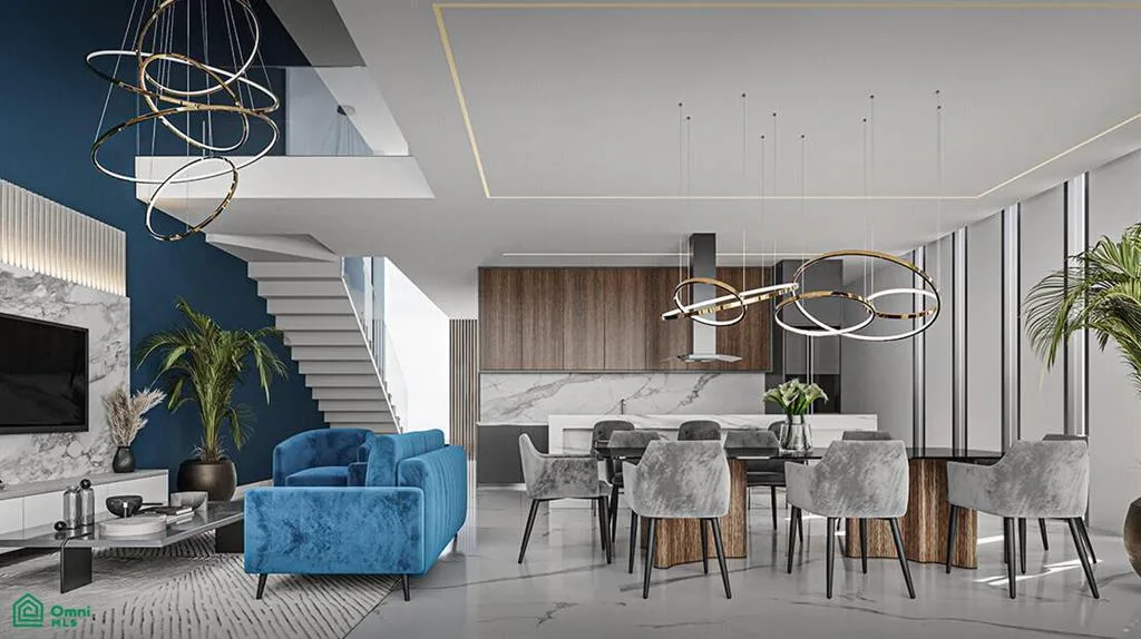 Notable design details include extraordinary lighting from a 6-meter high window in the living room. The property features glass railings and extensive LED lighting throughout, including false ceilings with indirect illumination. There is a rear terrace with a pergola and a garden. The adjoining walls are lined with an elegant pebble-type finish. The home includes preparation for both electric curtains and the future installation of solar panels.