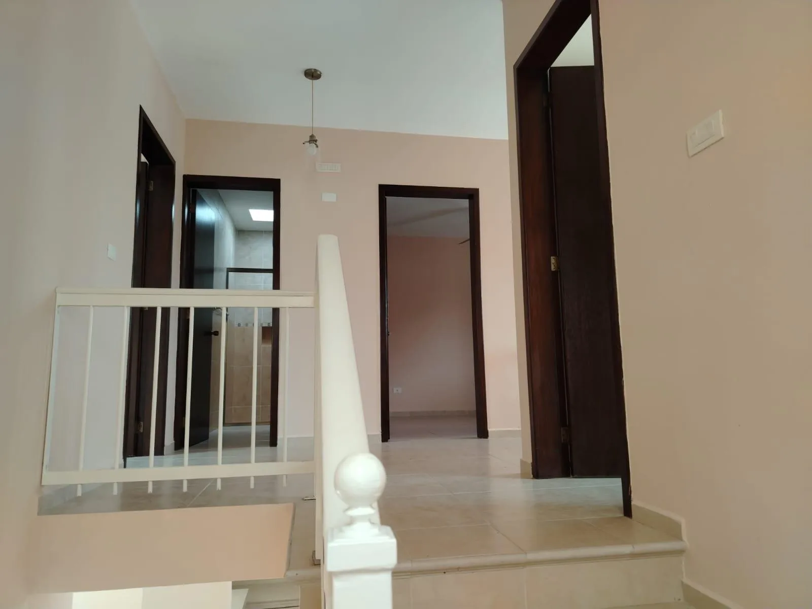 The upper floor is dedicated to the sleeping quarters. The main bedroom features an en-suite bathroom, a walk-in closet, a ceiling fan, and air conditioning. Two secondary bedrooms each have a private balcony, a closet, ceiling fans, and air conditioning. These two bedrooms share a full bathroom.