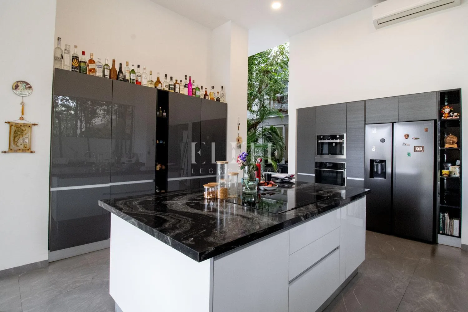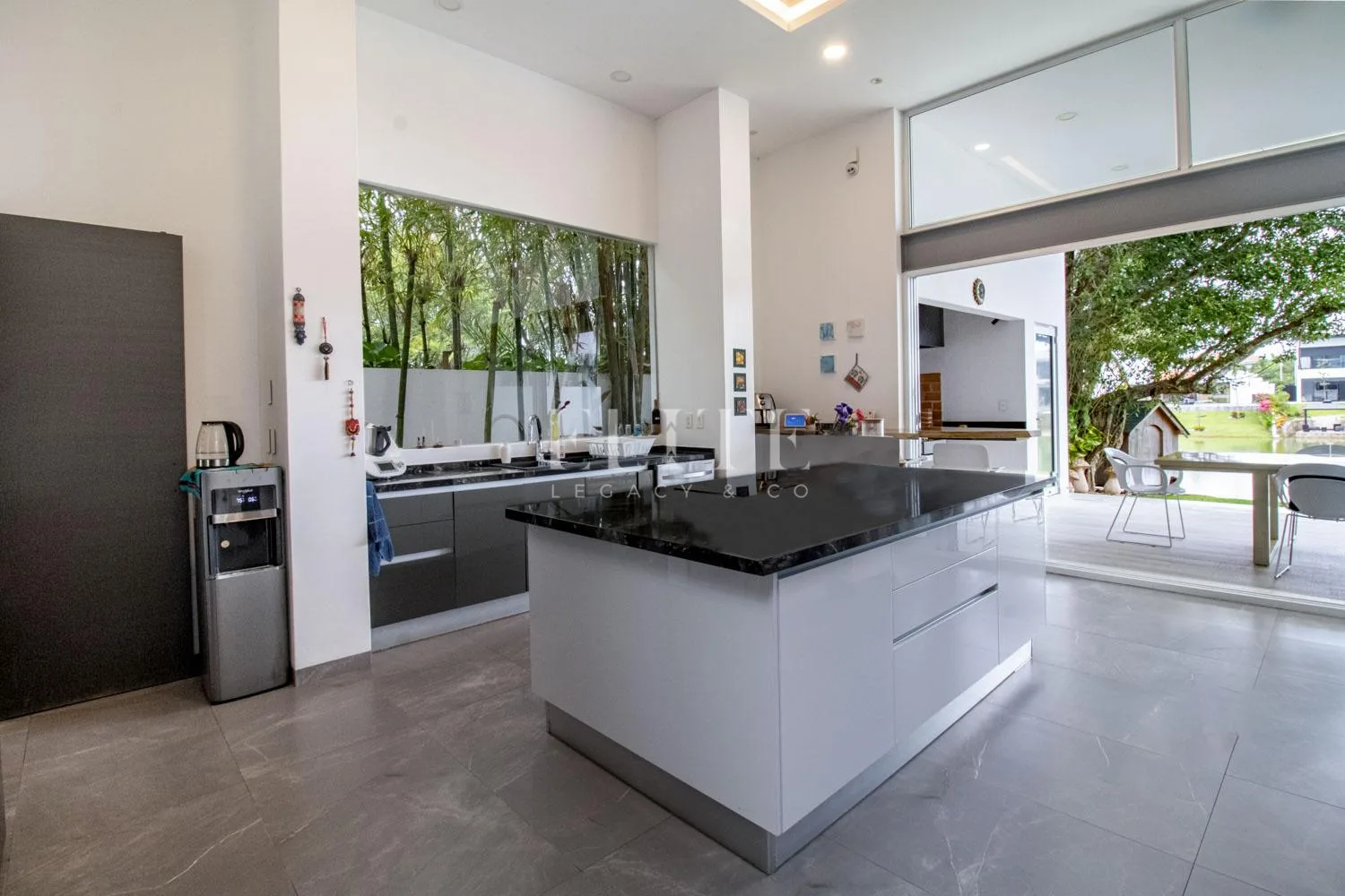 On the first level, there is a grand height living room, a double-height dining room with a 13-meter ceiling, and a 40-square-meter glass ceiling. An internal garden includes an 8-meter tall poplar tree. A large study has access from the exterior. This level also features a full bathroom, an equipped integral kitchen with all-electric appliances, an island, and a breakfast bar, a pantry, a terrace with a sunken round living area, a grill, a half bathroom, a large garden with a pool, a deck for kayaks, a dock for lake access, a laundry room, a service room with a full bathroom, two spacious service hallways, a very spacious storage room, and partially covered parking for six cars.