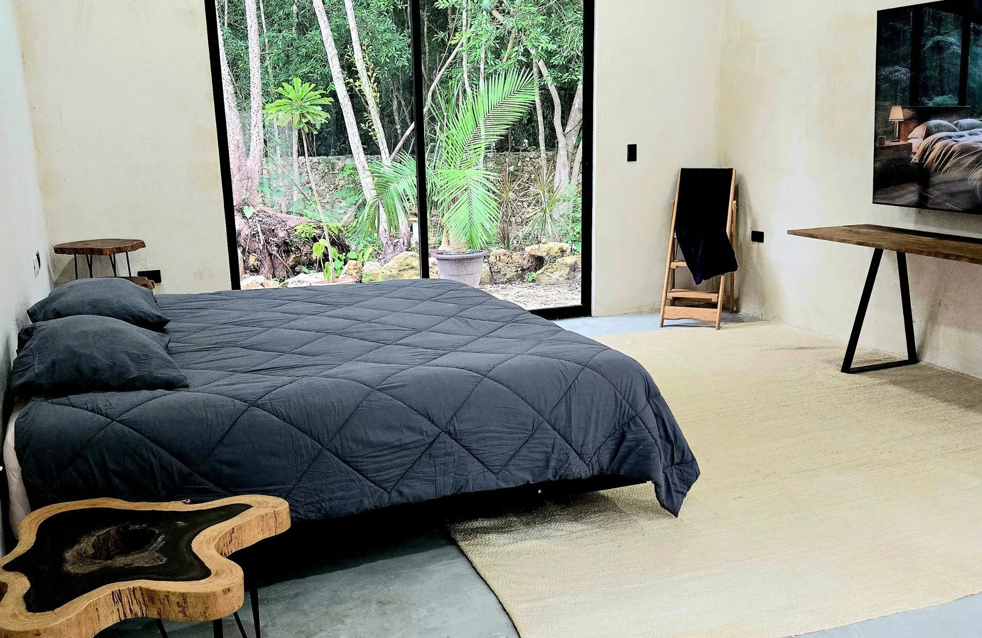 The architecture is modern, in a Boho & Tulum style, utilizing regional and ecological materials such as Chukum in the pool, kitchen, and bathrooms, natural washed cement floors, and local wood. It features luxury black window frames and various quality woods, including parota plywood. Large windows provide natural light and cross-ventilation throughout the interior.