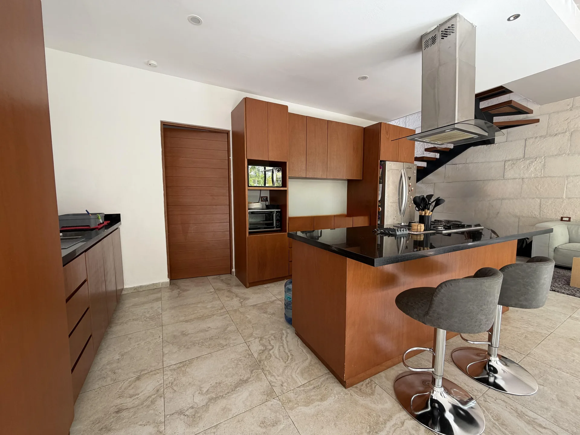 This level is complemented by a spacious laundry area, a service room with a full bathroom, and a guest half-bathroom. The upper floor houses three bedrooms, including an excellent-sized master bedroom with a full bathroom and walk-in closet, designed to provide privacy, comfort, and rest.