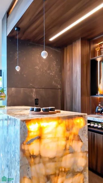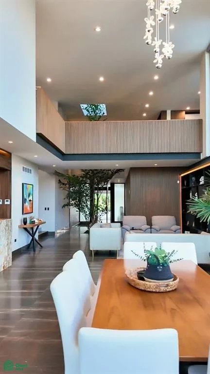 The main entrance opens to a double-height living room, which flows to a bar and a fully equipped kitchen. The hall features a water mirror with a bridge, and natural wood finishes are present throughout the home, including in a dedicated library.