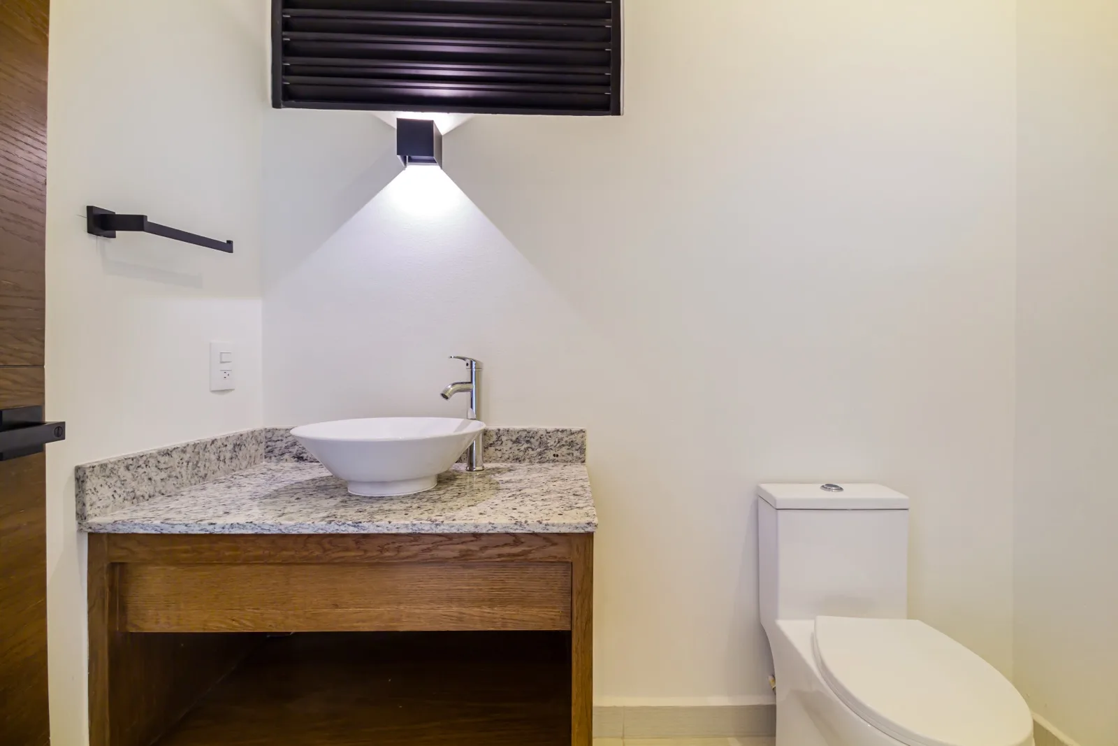 The kitchen is finished with granite and parota wood. There are two covered parking spaces.