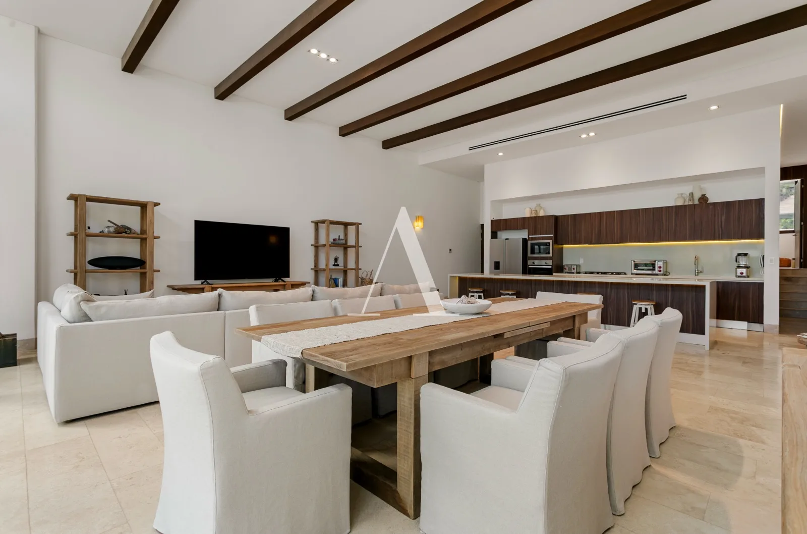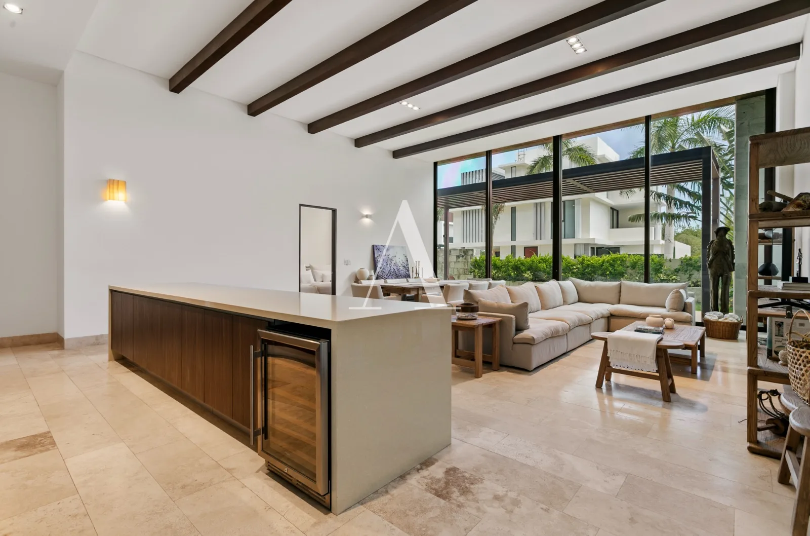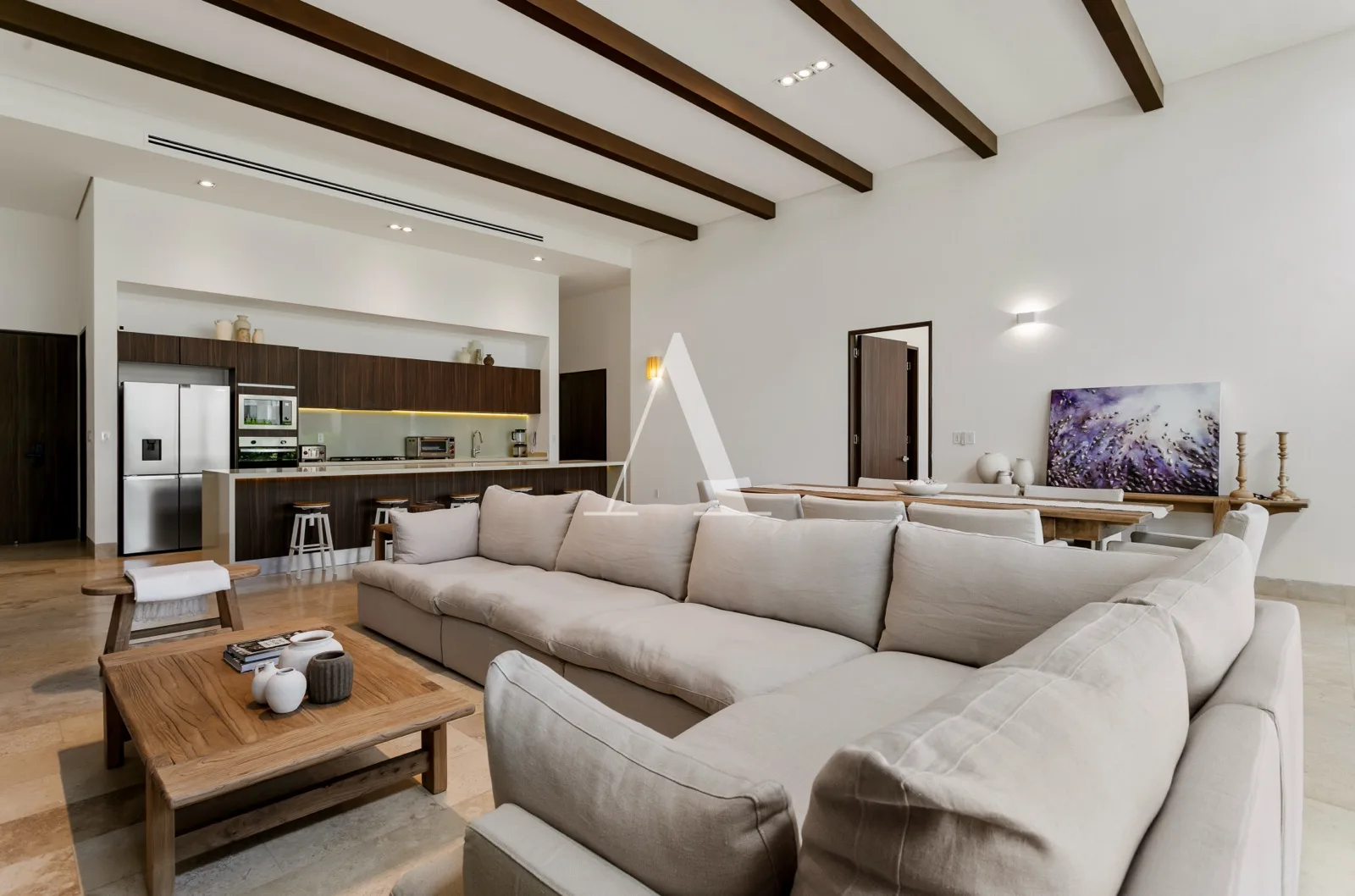 The residence is furnished and decorated in a minimalist style with warm tones. The expansive living and dining areas integrate seamlessly with the kitchen. The kitchen features a large quartz bar counter and is fully equipped with high-end appliances.