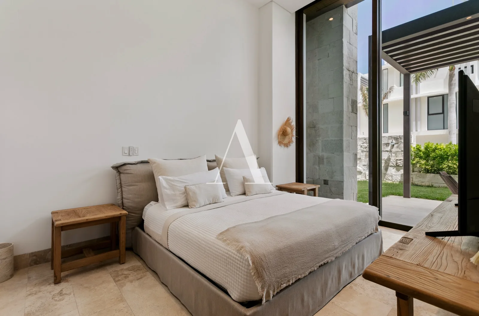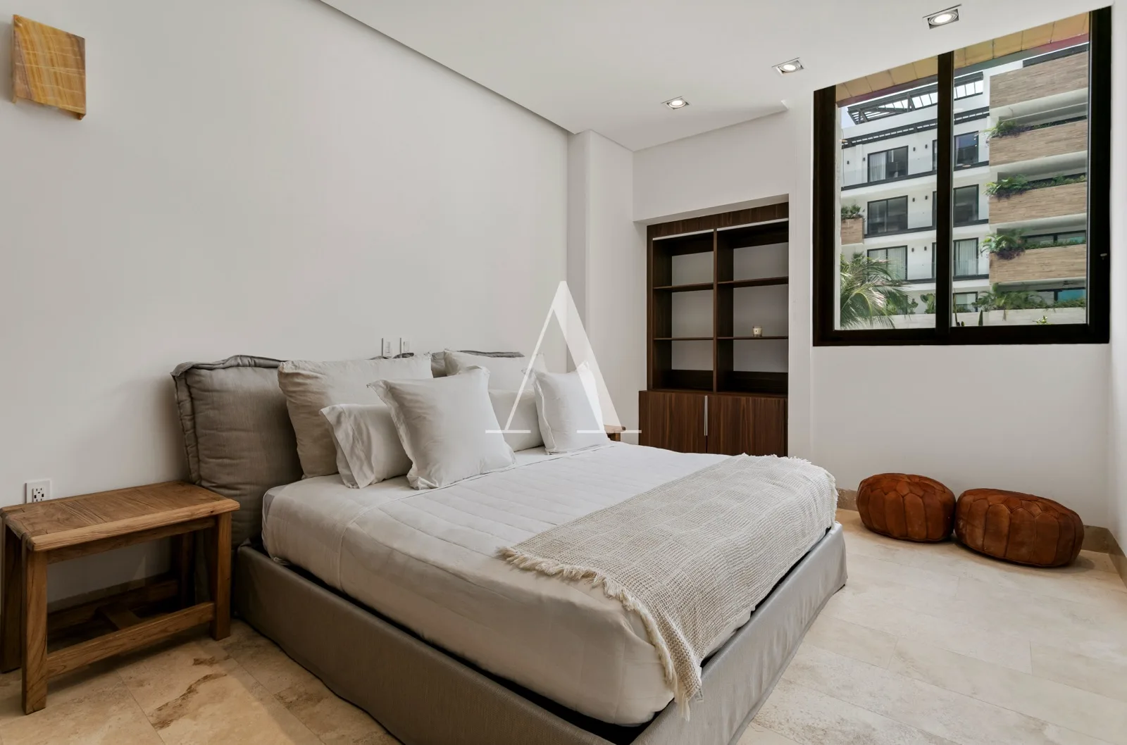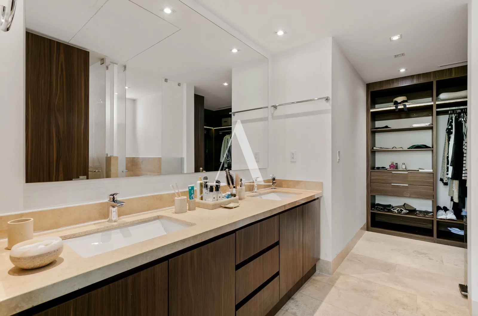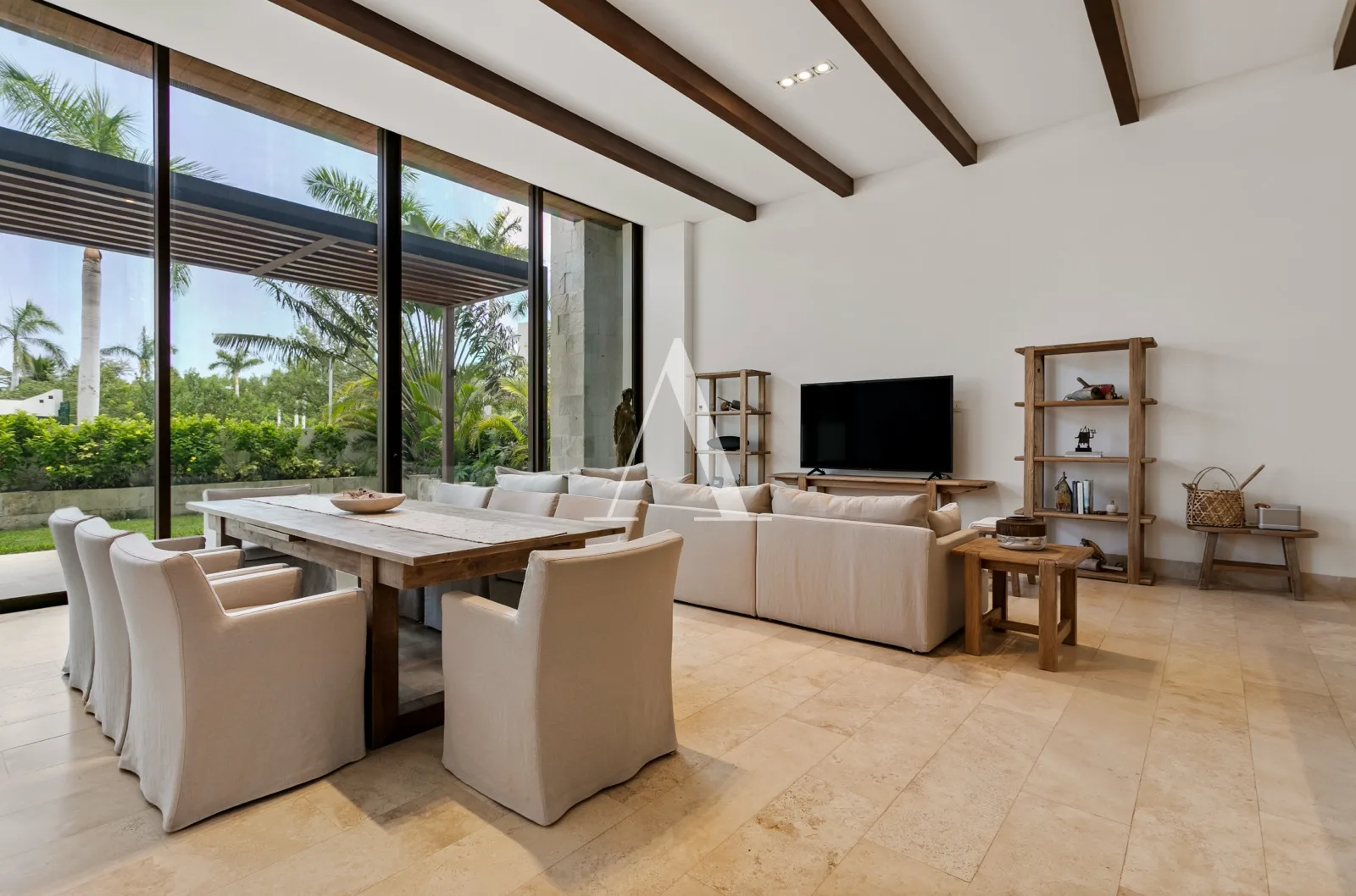 The residence is furnished and decorated in a minimalist style with warm tones. The expansive living and dining areas integrate seamlessly with the kitchen. The kitchen features a large quartz bar counter and is fully equipped with high-end appliances.