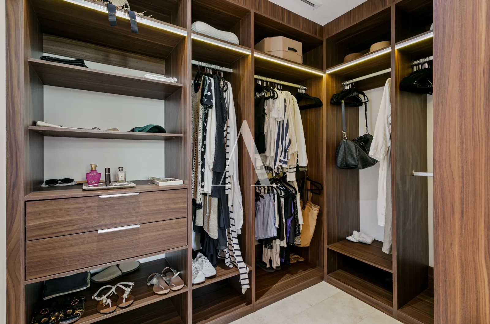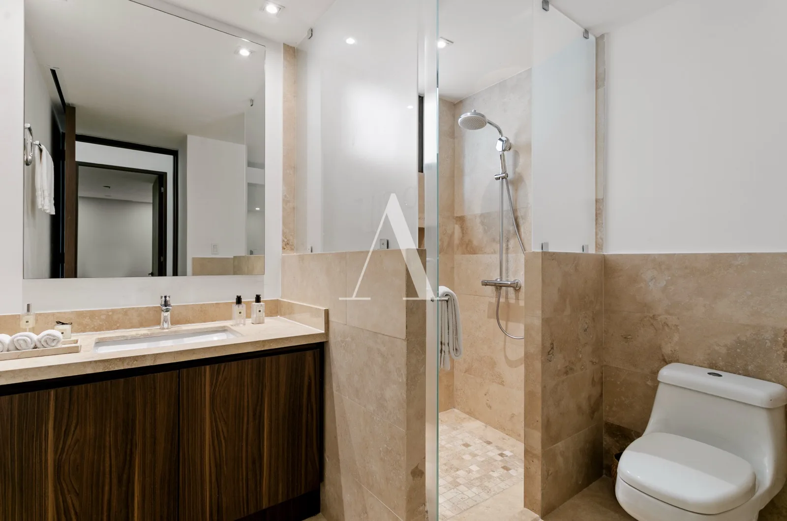 The unit consists of three spacious bedrooms. The primary bedroom has direct access to the terrace, a large walk-in closet, and a bathroom with dual vanities. The first secondary bedroom includes a closet, a bathroom, and an exterior view. The second secondary bedroom features a dressing area and an exterior view.