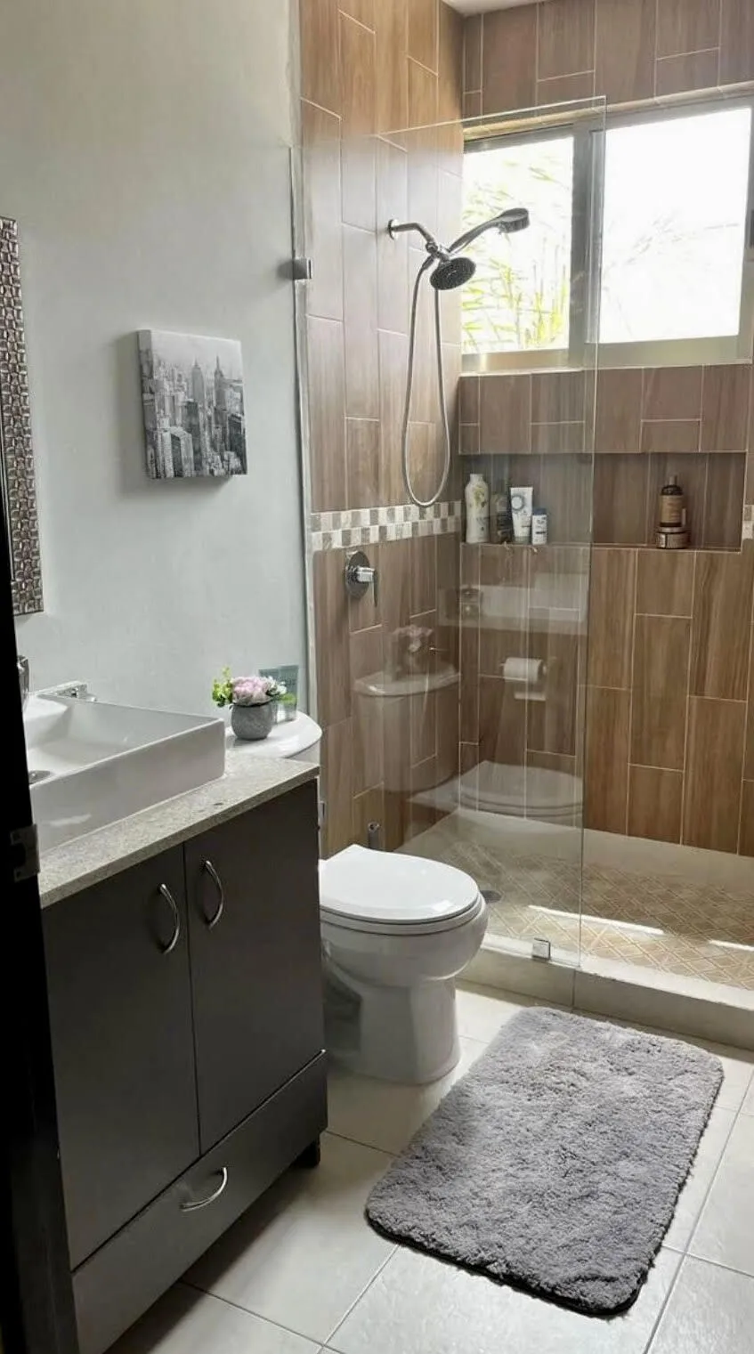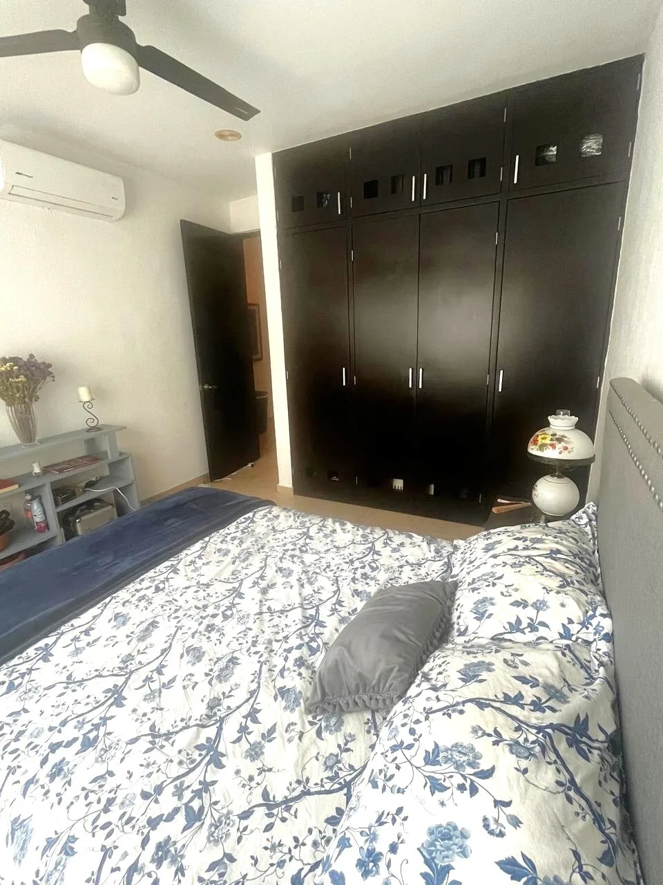 There are two secondary bedrooms with spacious built-in wardrobes. One bedroom has a balcony. Both secondary bedrooms have new mini-split inverter air conditioning units and ceiling fans. They are served by a newly renovated shared bathroom featuring a glass shower door, a marble vanity cabinet and countertop, and a new high-quality sink and faucets.