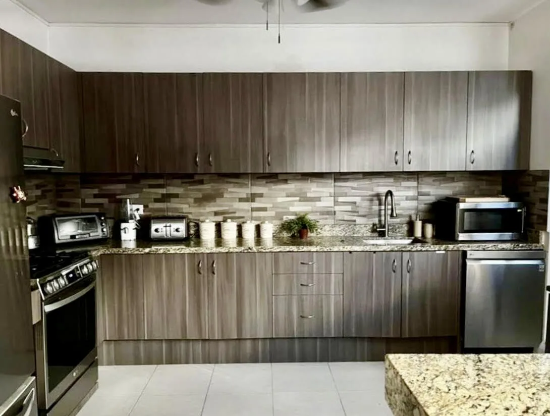 The ground floor includes a living room, a dining area, and a completely new external kitchen with marble countertops, a bar counter, and space for a dishwasher. A newly renovated half bathroom is on this level. The floor is equipped with a new mini-split inverter air conditioning unit and three ceiling fans. There is an additional living or office space. An internal laundry room has an external door, a sink, and designated space for a washing machine and dryer.