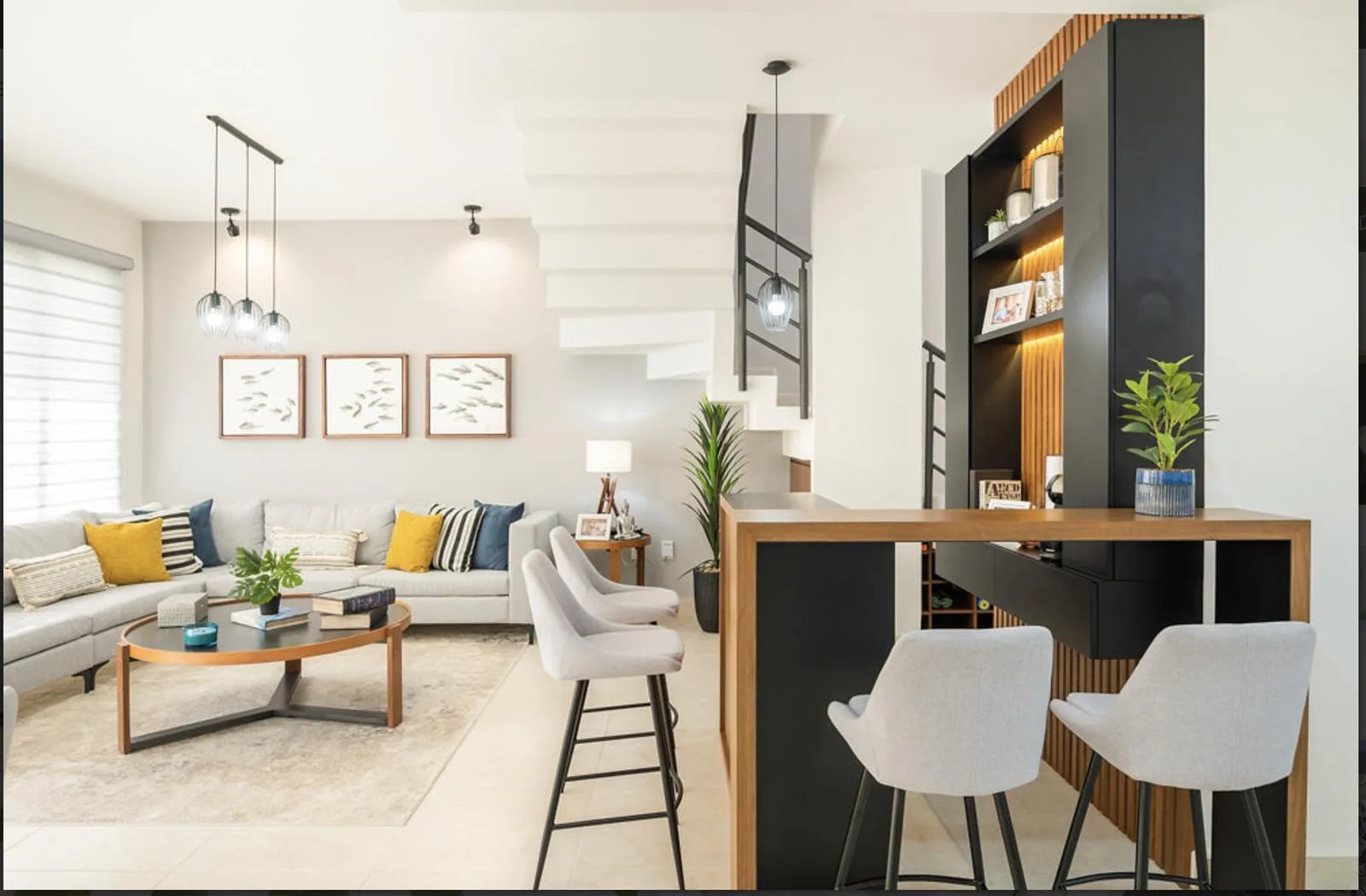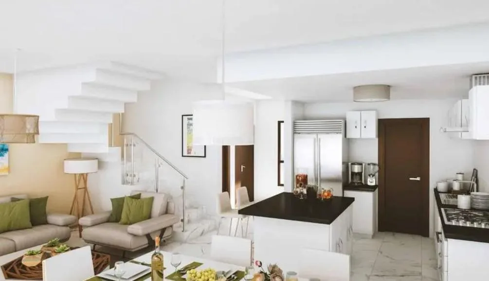 The ground floor welcomes with an open-concept living and dining room, ideal for family or social gatherings. The modern and efficient kitchen connects naturally with the social area, creating a warm and sophisticated atmosphere. This level also includes a half bathroom for guests and parking for two cars.