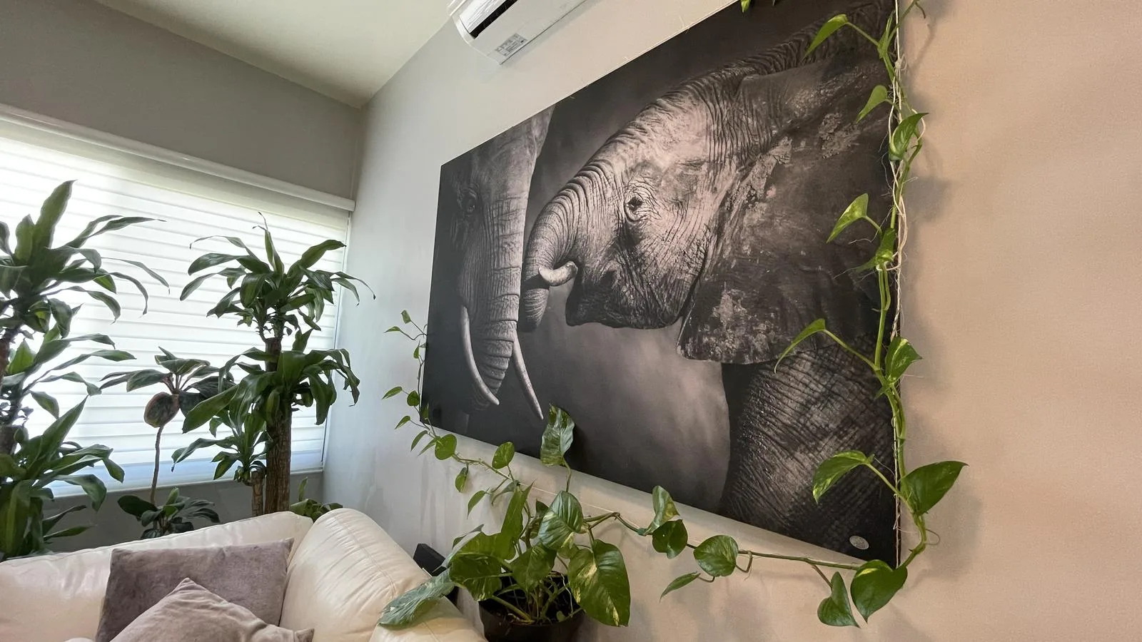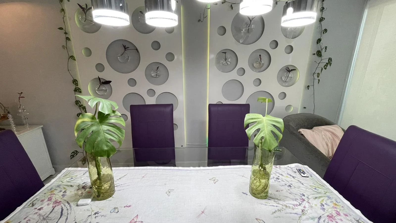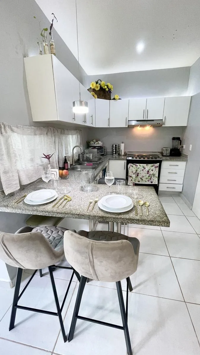 An enclosed utility room protects the washing machine and offers storage space, with capacity for three large bicycles. The patio is fitted with a retractable awning. The kitchen includes a compact rack for nine water jugs and enclosed pantry compartments. Decorative light fixtures are installed throughout. The master walk-in closet features a pull-out rack for purses plus specialized compartments. The interior paint has been freshly retouched. The air conditioning systems have received recent maintenance.